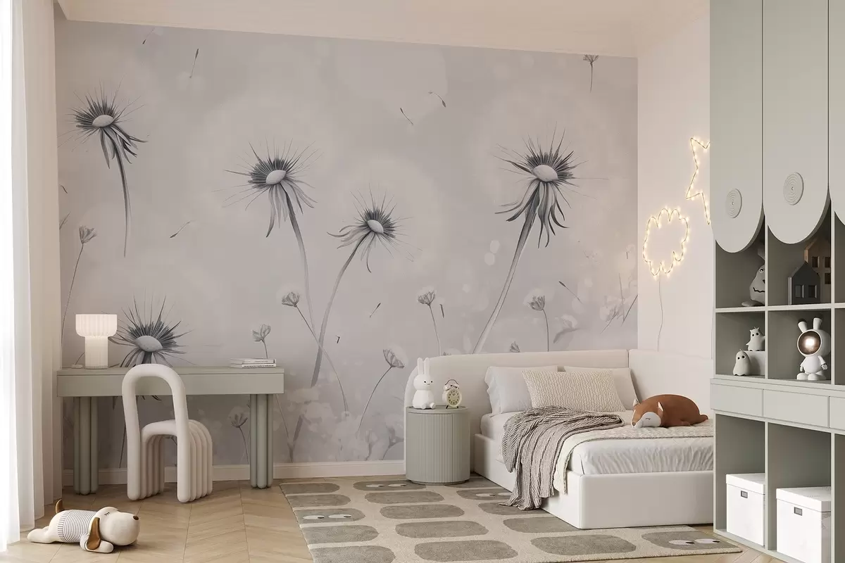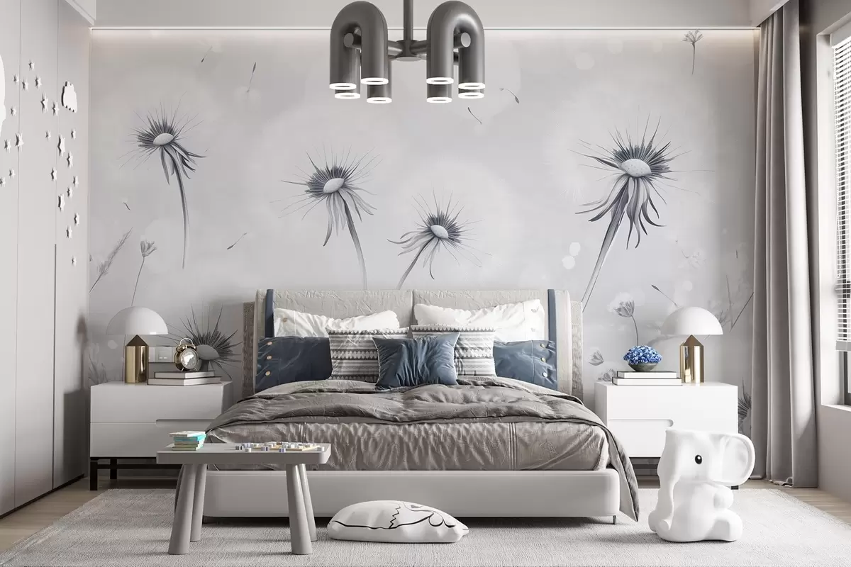 Papier peint photo Élégants pissenlits et fleurs sauvages dans un style pictural dans les tons bleus N° w08657v2