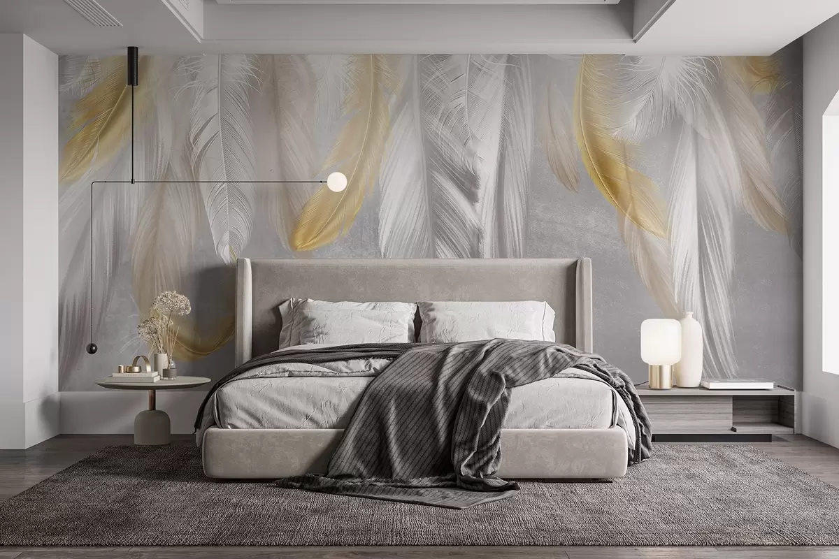 Papier peint photo Plumes blanches et jaunes suspendues sur un fond gris doux, créant une composition délicate et aérienne N° w08670
