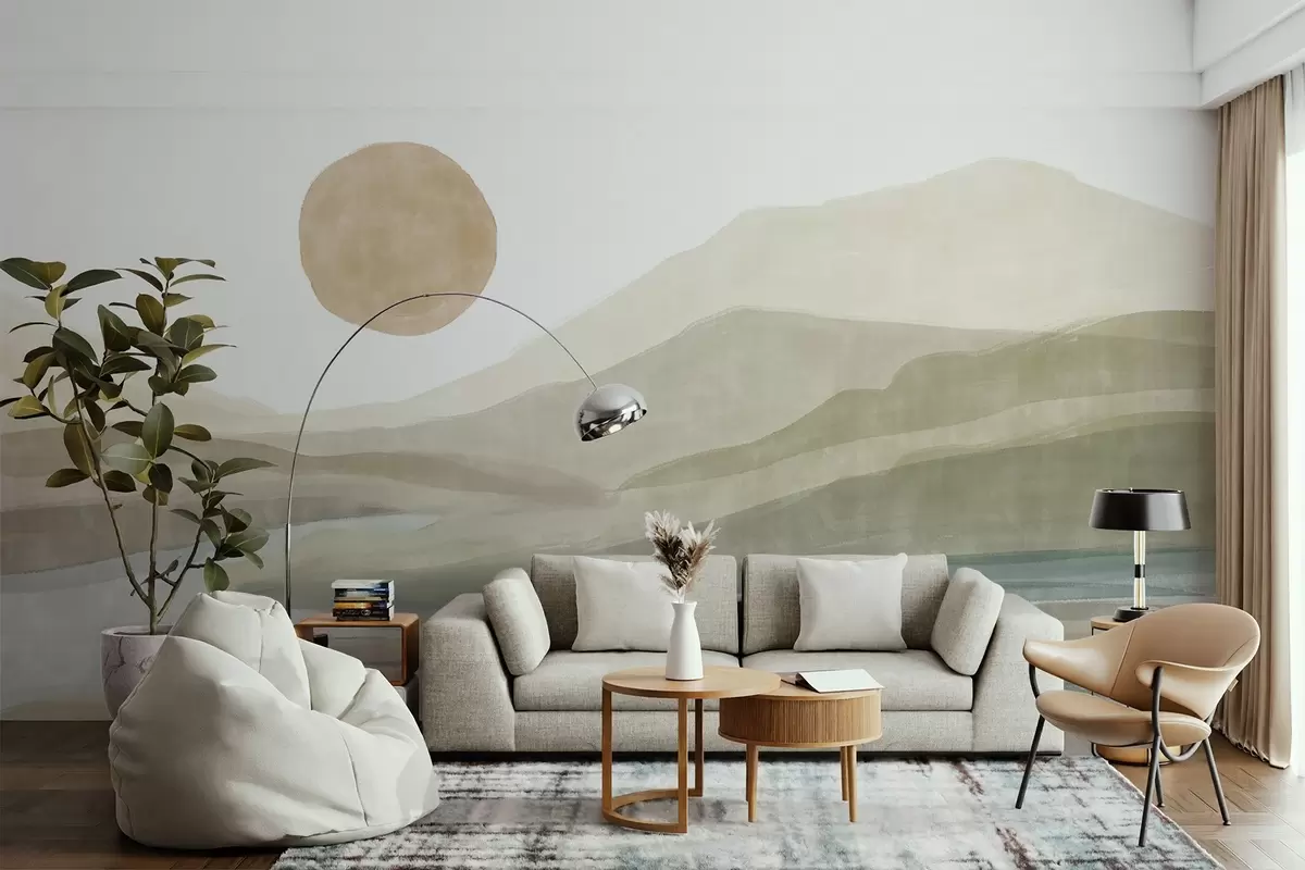 Papier peint photo Un paysage de montagnes étagées avec un doux gradient, une rivière sinueuse, un soleil orange atténué dans le ciel N° w08702