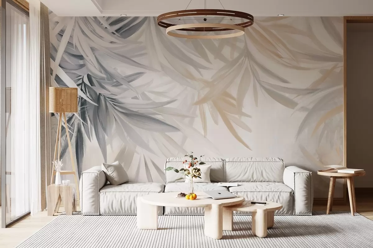 Papier peint photo Feuilles tropicales douces et fluides de couleur claire dans des tons gris et pêche, se fondant dans un imprimé pâle et neutre N° w08703