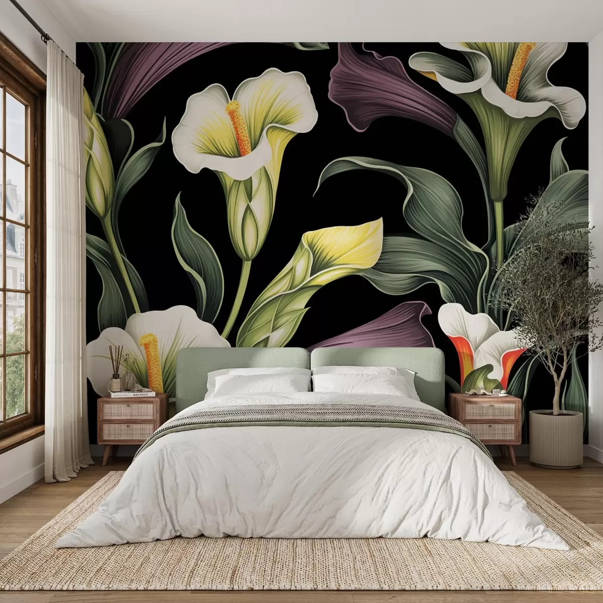 Papier peint photo Lys calla blanc-vert et violet sur fond noir N° w08752