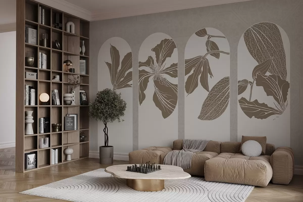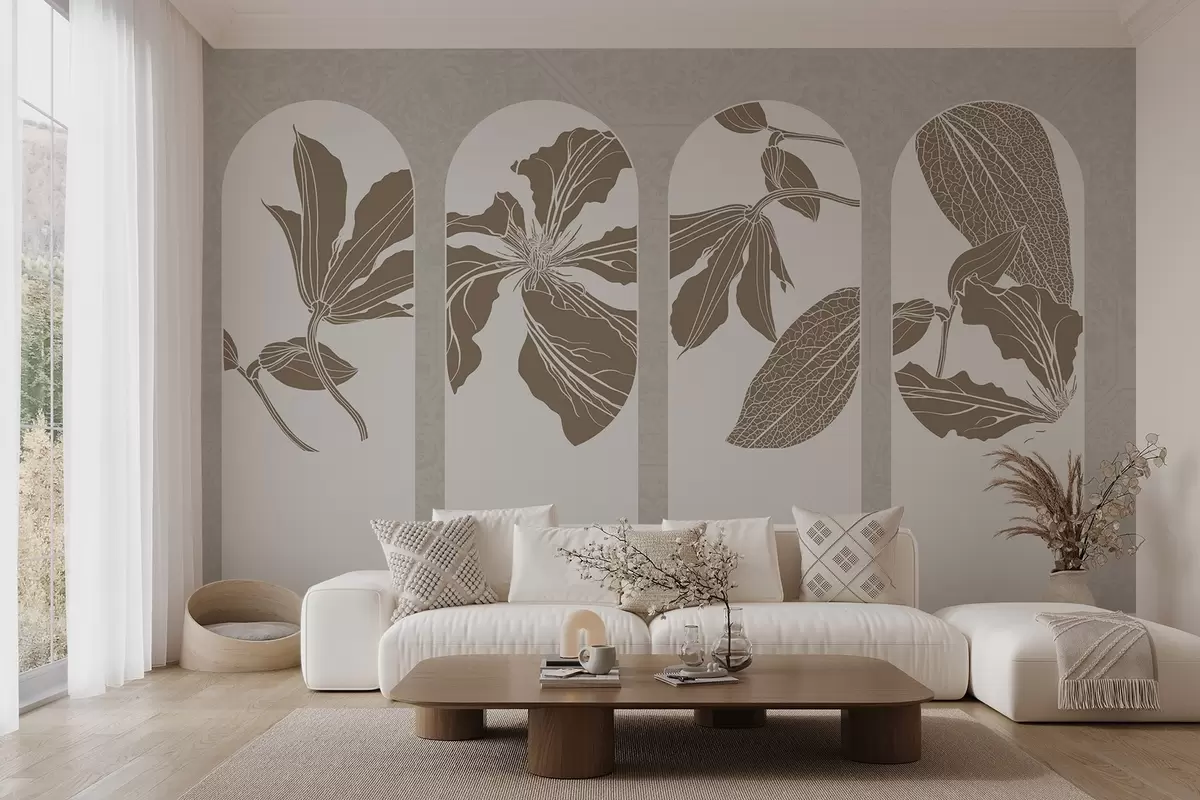 Papier peint photo Arcs élégants avec des motifs floraux en beige et blanc, sur un fond beige texturé, style minimaliste N° w08866