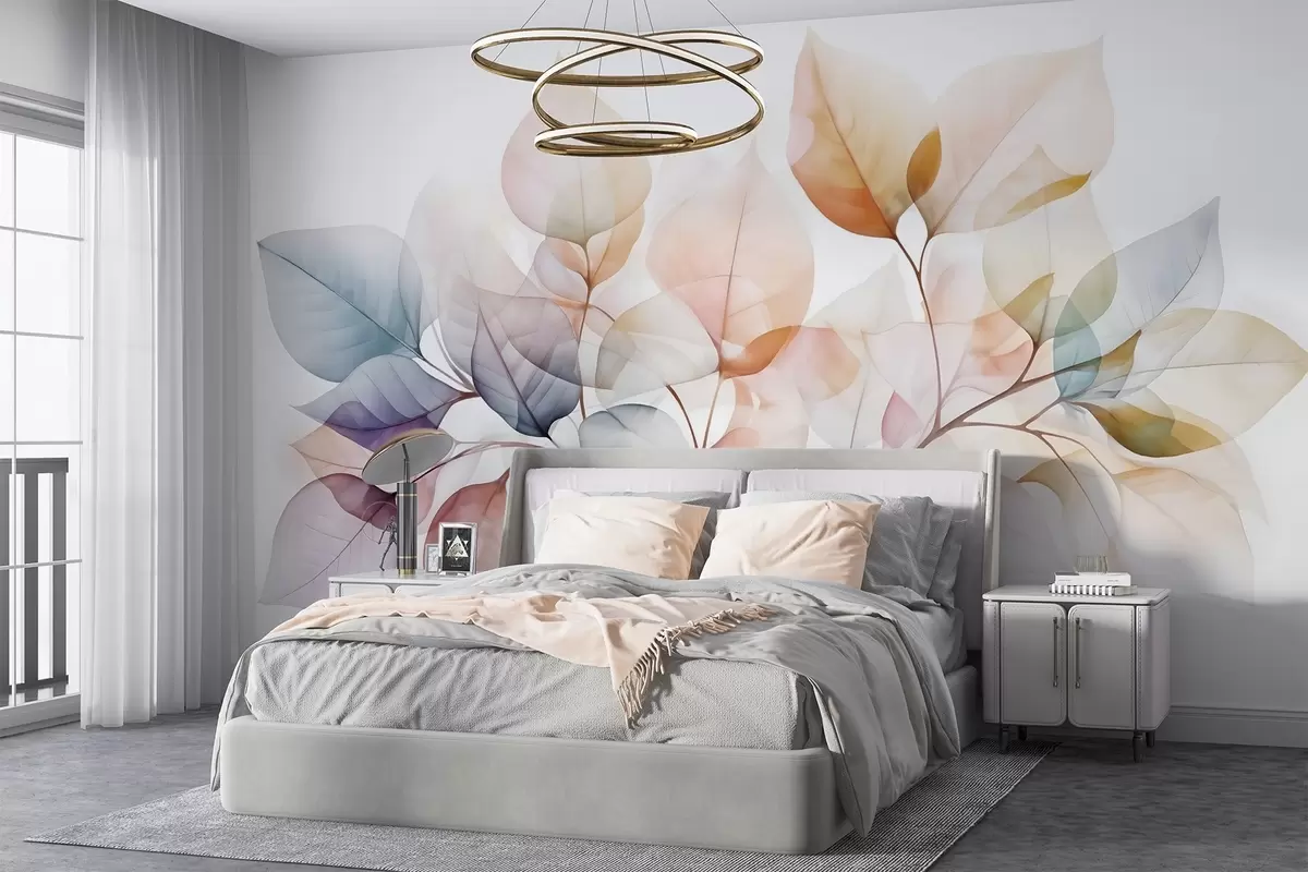 Papier peint photo Aquarelle de feuilles translucides aux couleurs pastel, avec des nuances de rose, de blanc, de violet et de bleu N° w08910