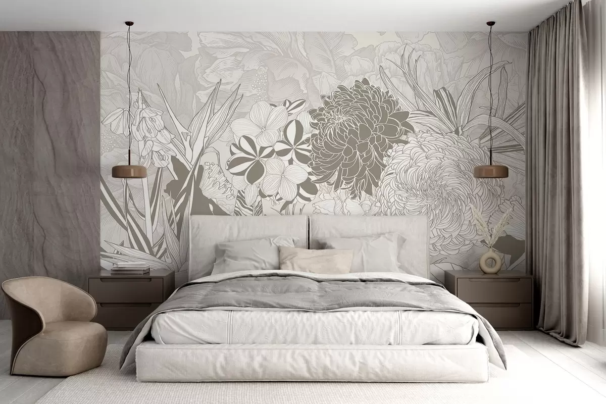 Papier peint photo Fleurs et feuilles dans les tons beiges, y compris chrysanthèmes, plumeria et feuillage tropical, dessin botanique N° w08976