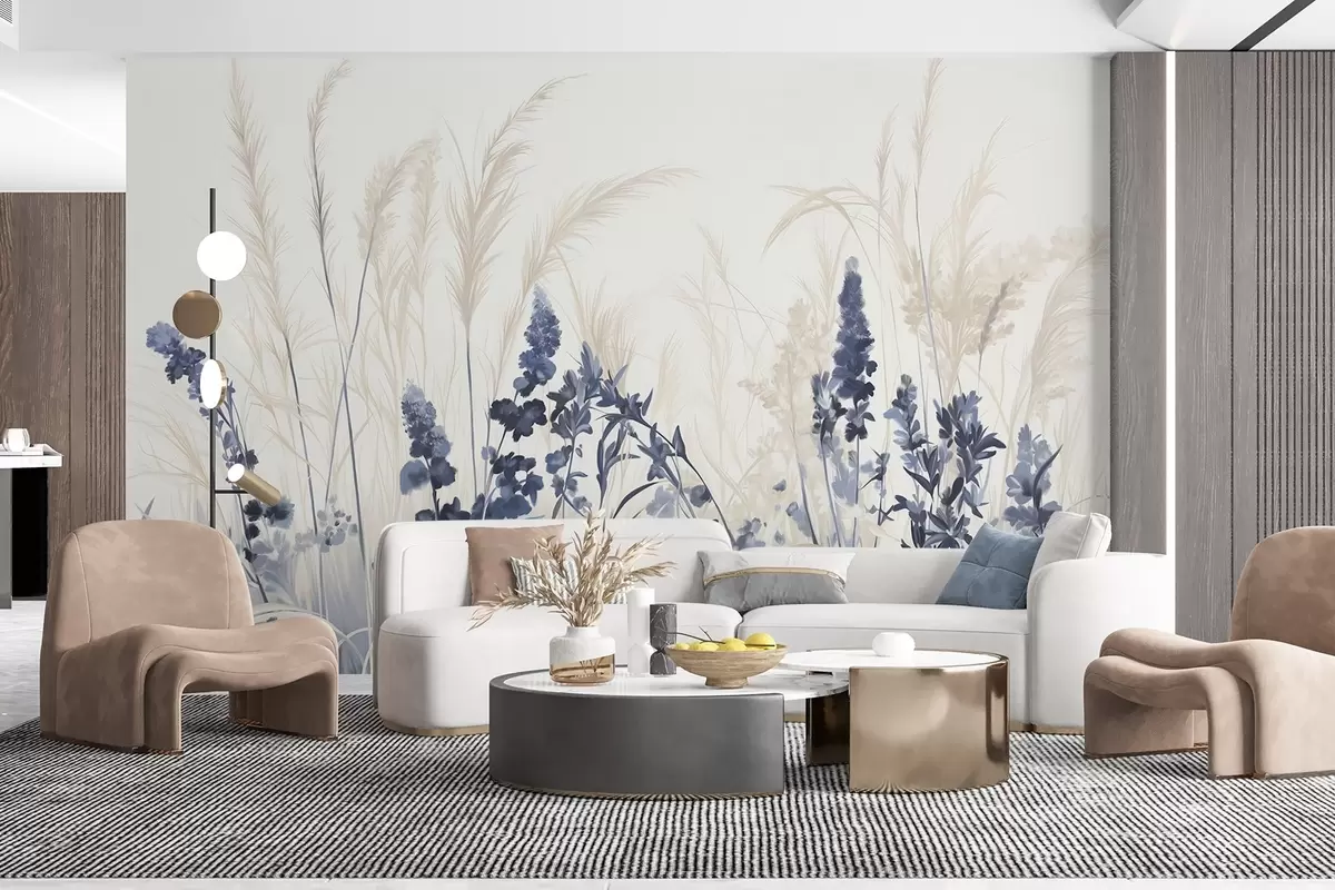 Papier peint photo Fleurs bleues et roseaux beiges dans un champ, texture de peinture minimaliste, fond clair, couleurs douces, coups de pinceau délicats N° w08982