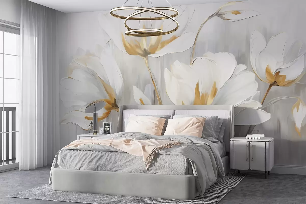 Papier peint photo Fleurs abstraites blanches avec des pétales et des tiges blanches sur un fond gris avec des coups de pinceau verticaux gris et blancs N° w09047