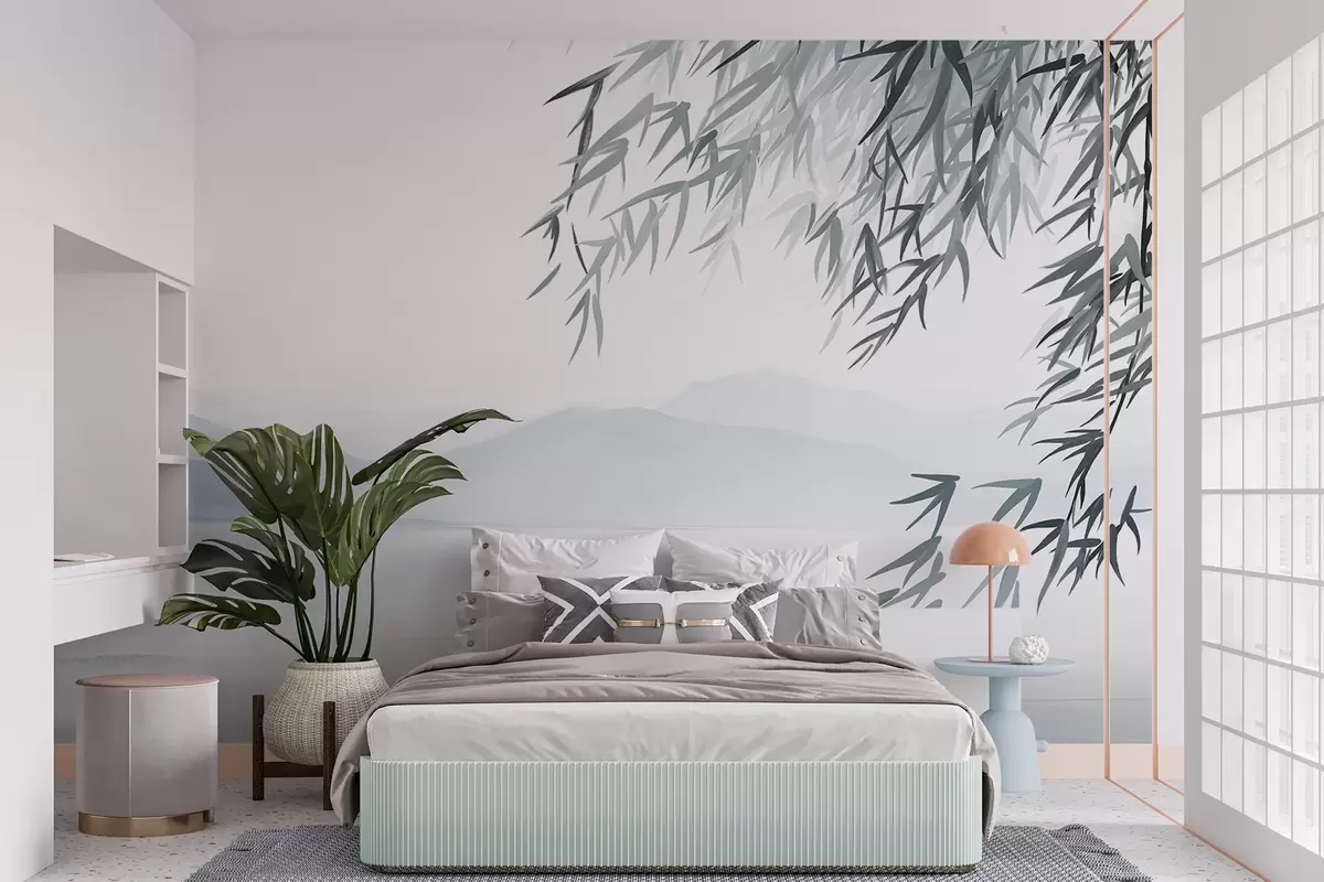 Papier peint photo Feuilles de bambou suspendues au-dessus d'un lac avec des montagnes en arrière-plan, tons doux de bleu et de blanc, style peinture au lavis d'encre N° w09048