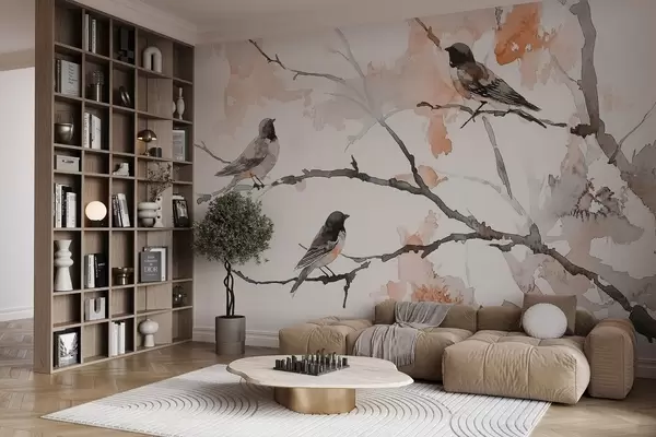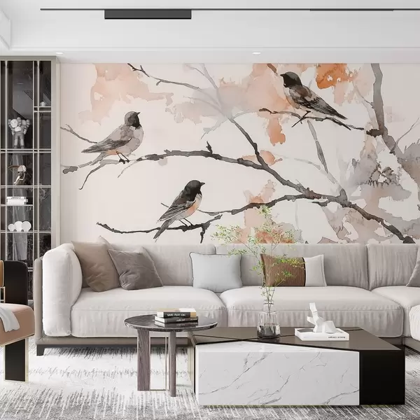 Papier peint photo Oiseaux sur des branches d'arbre en style aquarelle w09064v2