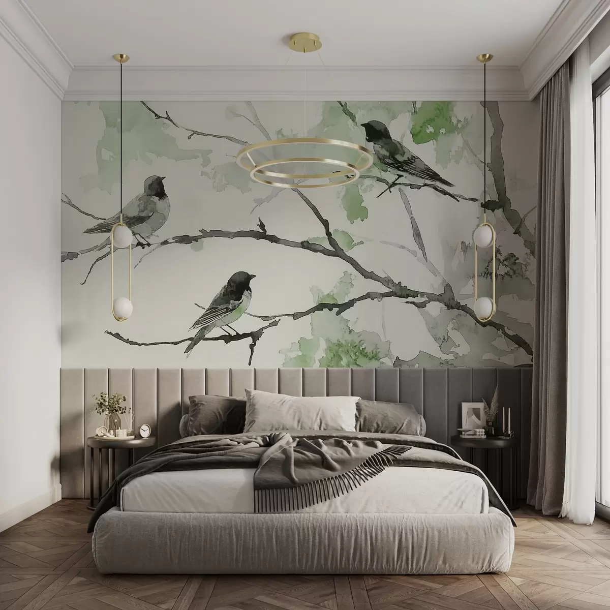 Papier peint photo Oiseaux sur des branches d'arbre en style aquarelle N° w09064v3