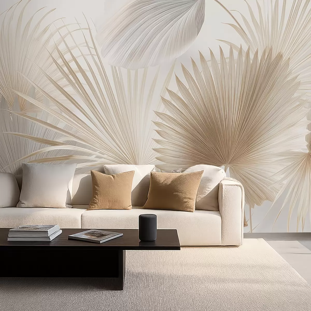 Papier peint photo Éventails de feuilles tropicales douces dans des tons beige clair et bleutés N° w09084