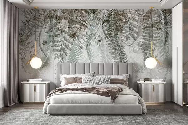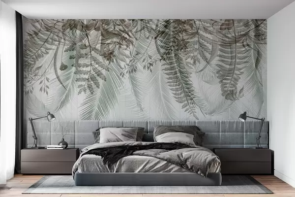 Papier peint photo Délicate chute de fougères tropicales et de feuilles de palmier, arrière-plan géométrique, lumière douce, couleurs sourdes, élégant N° w09106v1