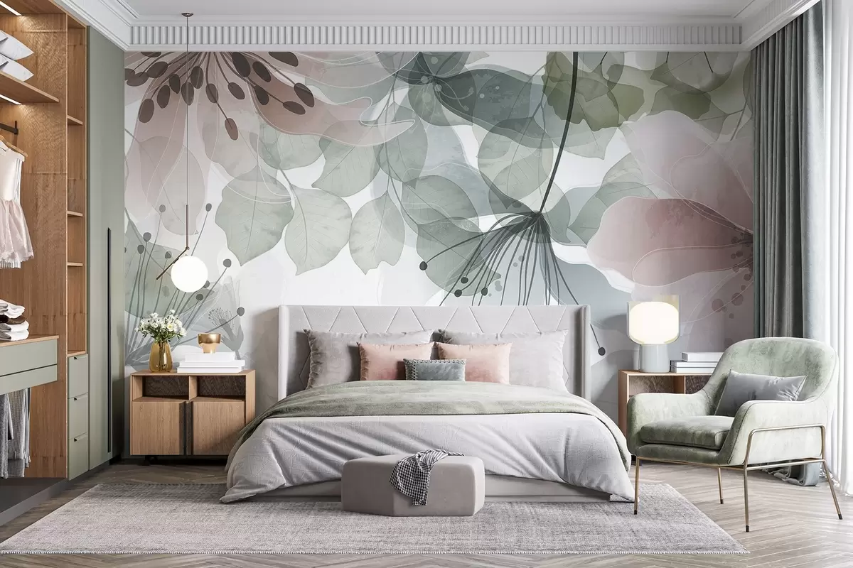 Papier peint photo Fleurs et feuilles aux couleurs pastel, pétales et feuilles translucides, effet aquarelle doux, lignes délicates, fond blanc N° w09107