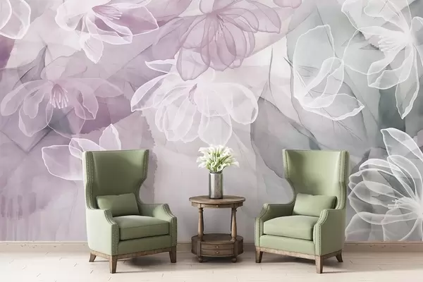 Papier peint photo Fleurs et feuilles aux pétales transparents dans les tons blanc, rose et vert, doux et délicats N° w09158v1