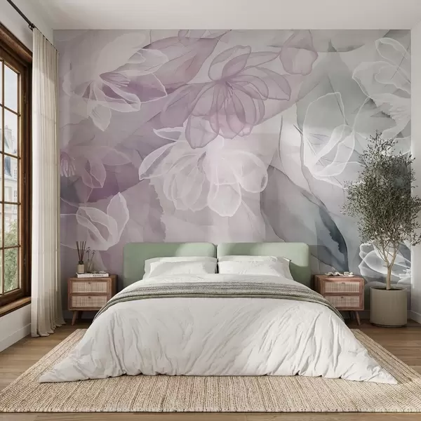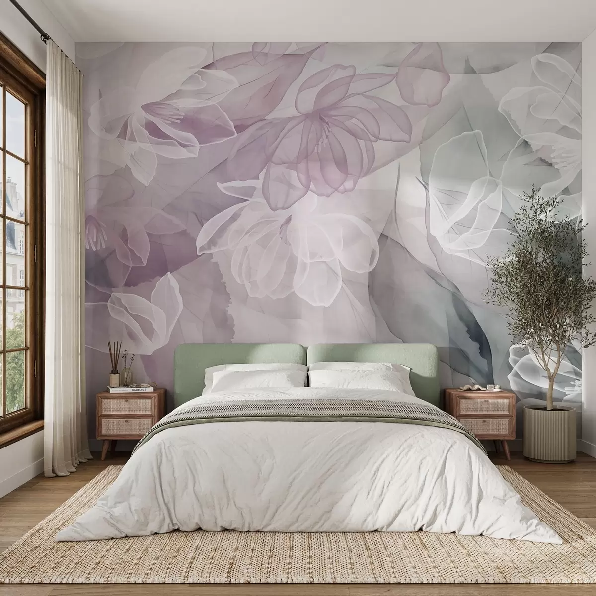 Papier peint photo Fleurs et feuilles aux pétales transparents dans les tons blanc, rose et vert, doux et délicats N° w09158v1