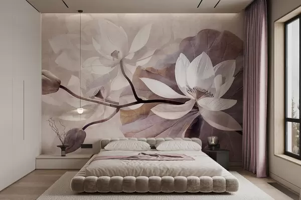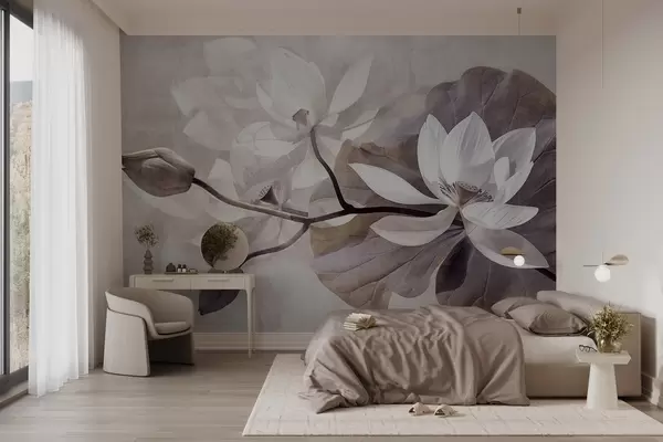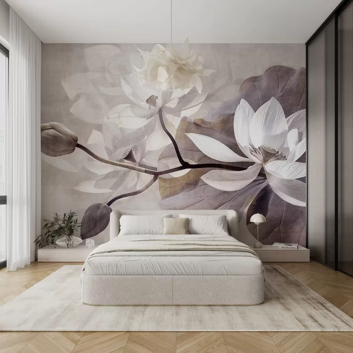 Papier peint photo Fleurs de lotus délicates avec feuilles et tiges dans une palette de couleurs douces et beiges N° w09159