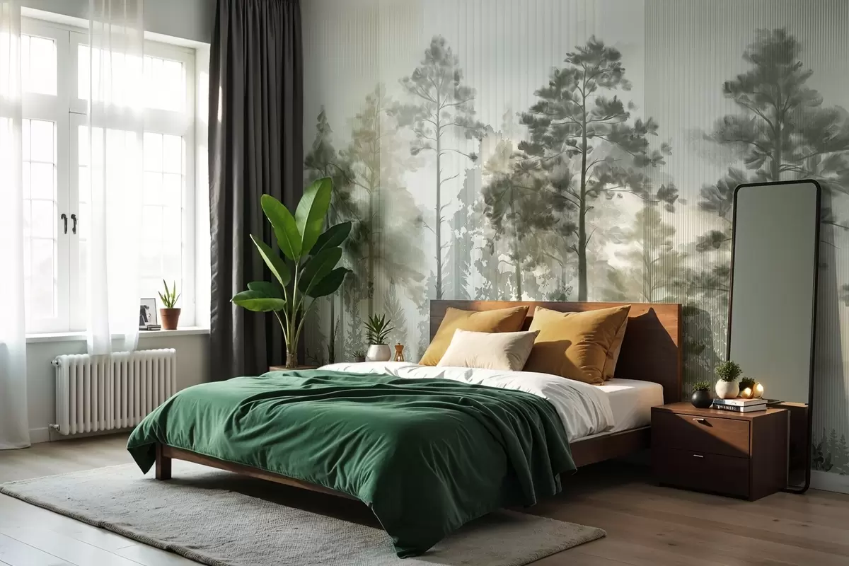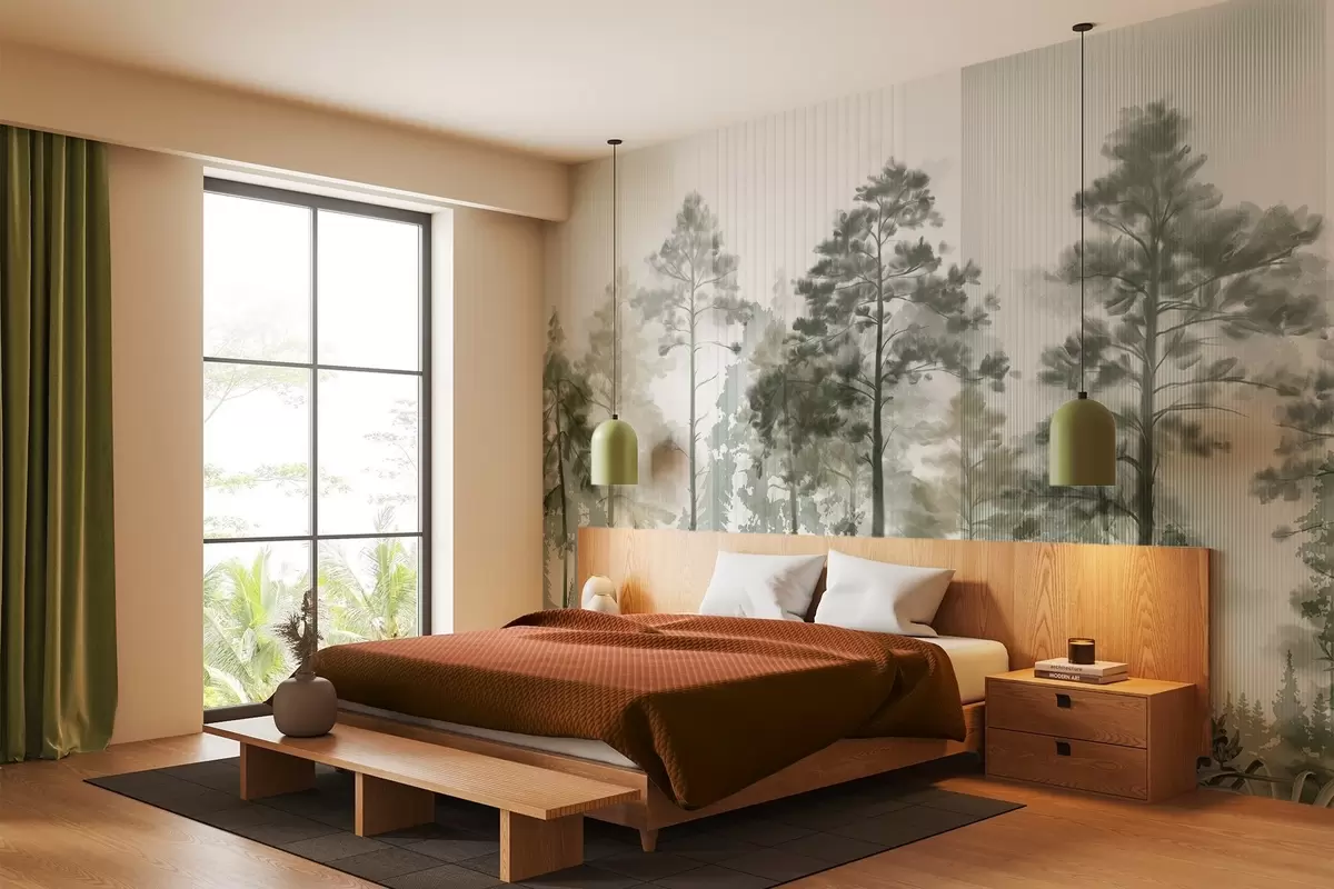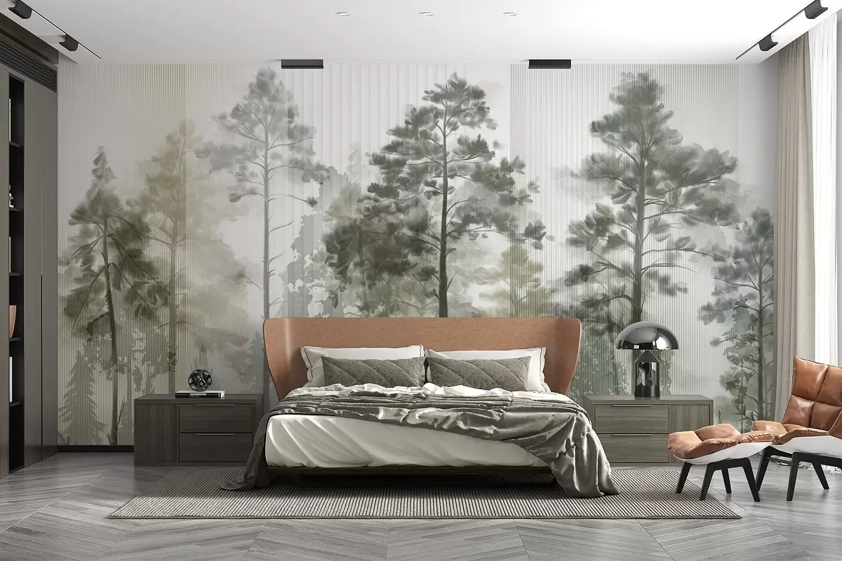 Papier peint photo Une forêt dense avec de grands pins, un feuillage vert luxuriant, une atmosphère brumeuse avec des textures de lignes verticales N° w09163