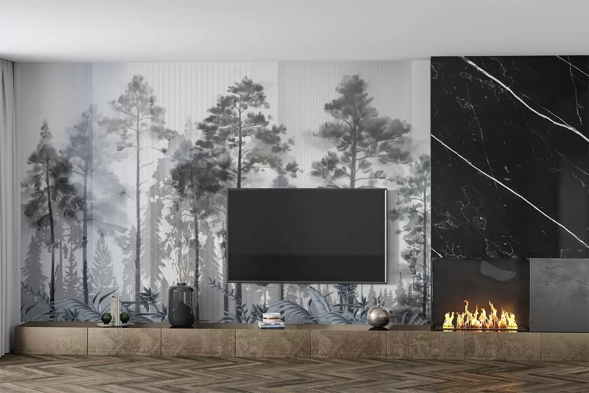 Papier peint photo Une forêt dense avec de grands pins, un feuillage gris et luxuriant, une atmosphère brumeuse avec des textures de lignes verticales N° w09163v2