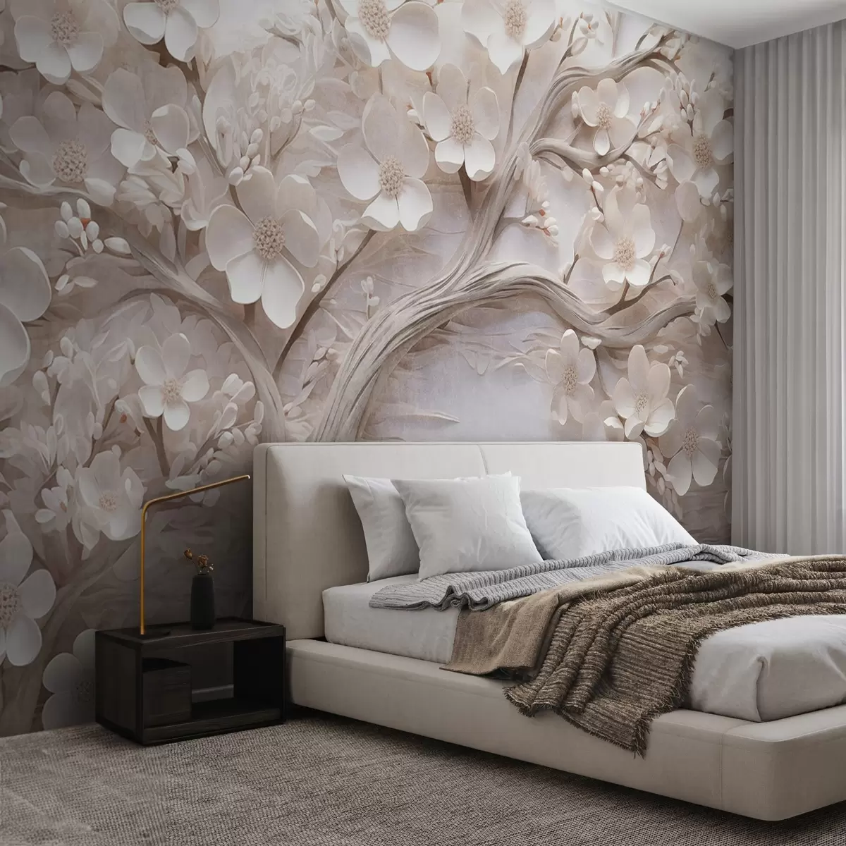 Papier peint photo Arbre texturé avec des fleurs blanches et un tronc brun, l'arrière-plan est blanc avec des lignes horizontales éclairage doux N° w09166