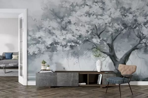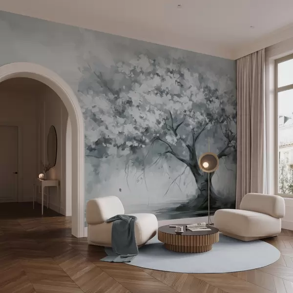 Papier peint photo Abstrait : arbre en fleurs bleu mat en pleine floraison, près d'une rivière, coups de pinceau doux et texturés et couleurs pastel N° w09193v2
