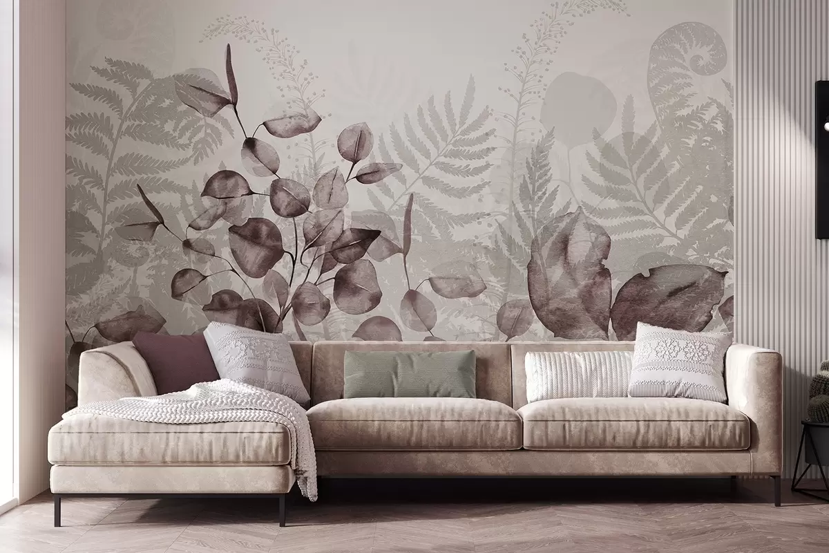 Papier peint photo Feuilles d'eucalyptus et de fougère dans les tons bordeaux et gris, effet aquarelle, illustration botanique N° w09197v1
