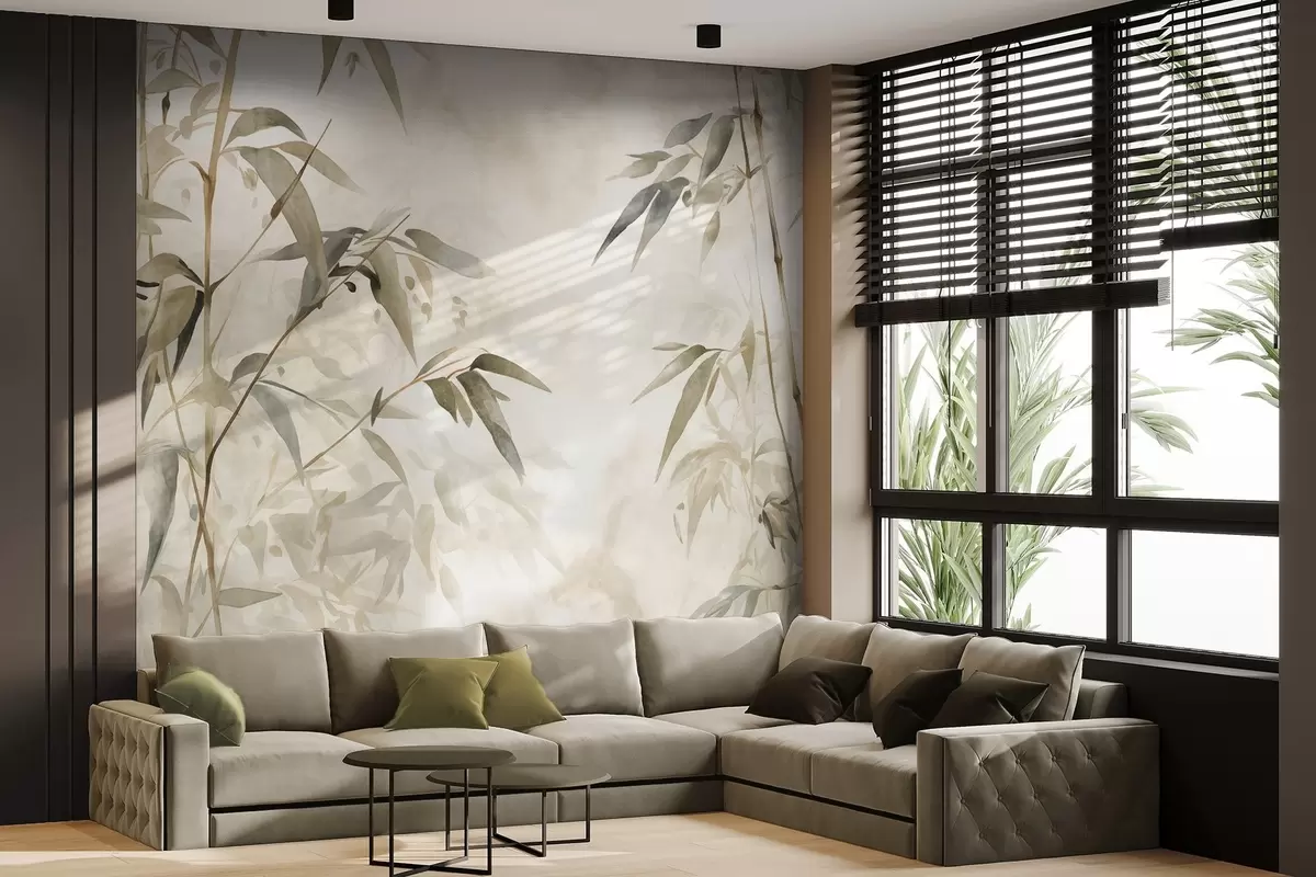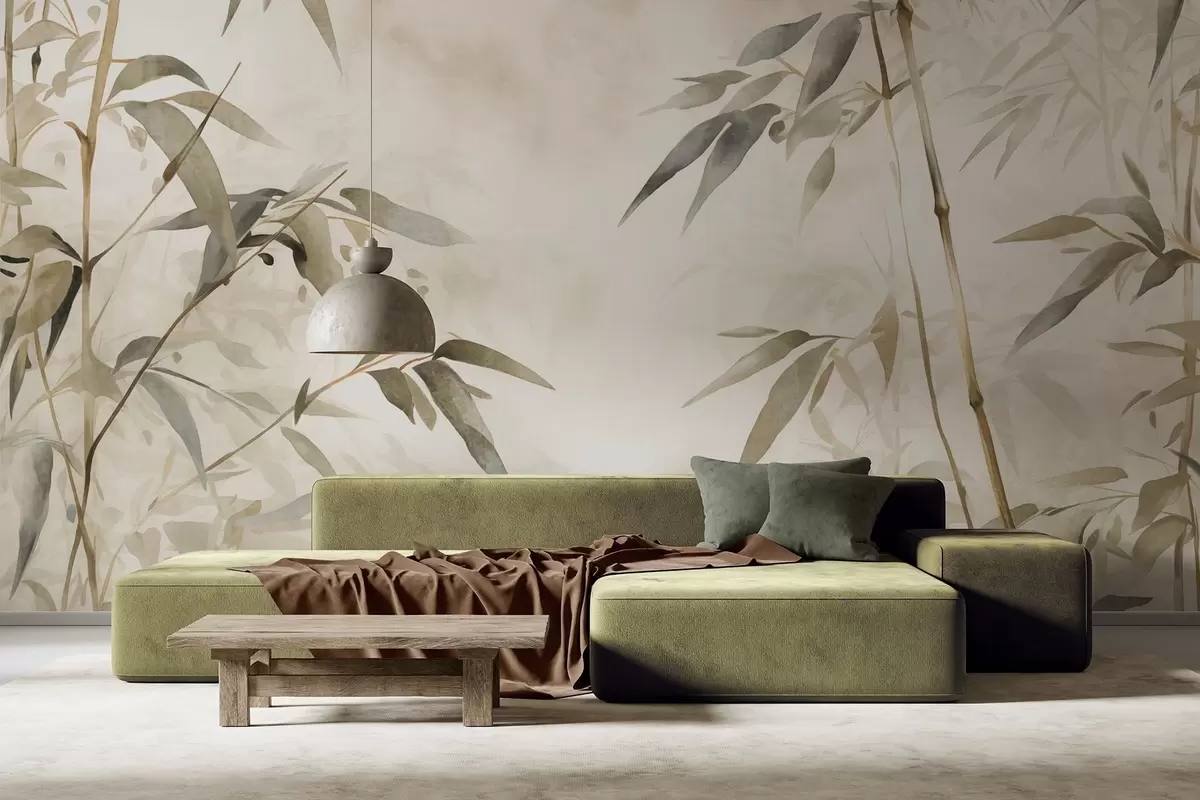 Papier peint photo Branches de bambou texturées avec des feuilles dans un style aquarelle, palette de couleurs neutres et douces, fond beige clair N° w09204