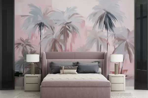 Papier peint photo Palmiers tropicaux abstraits, minimalistes et pastel, sur un fond de teintes sourdes roses et grises N° w09212v1