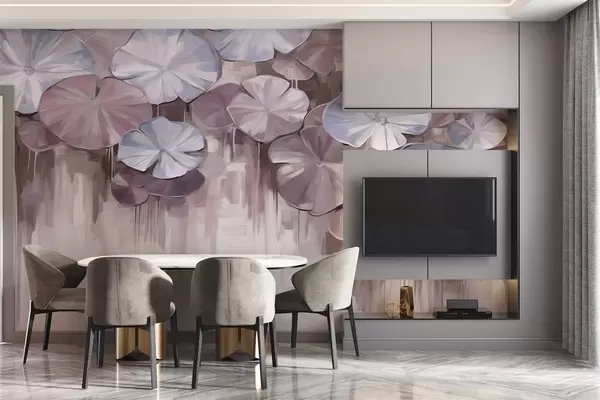 Papier peint photo Nénuphars texturés aux couleurs violettes et bleues dans un étang, l'arrière-plan est un mélange flou de douces nuances de violet w09255v1