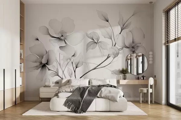 Papier peint photo Fleurs noires et blanches aux lignes élégantes sur fond gris N° w09271