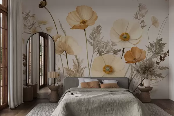 Papier peint photo Coquelicots vintage texturés orange et blancs avec tiges et feuilles fines, fond beige clair, style aquarelle N° w09293