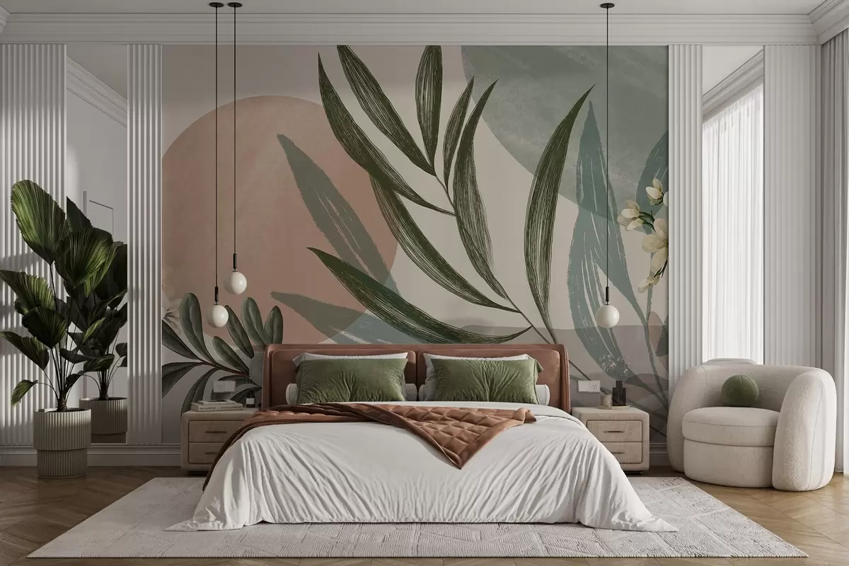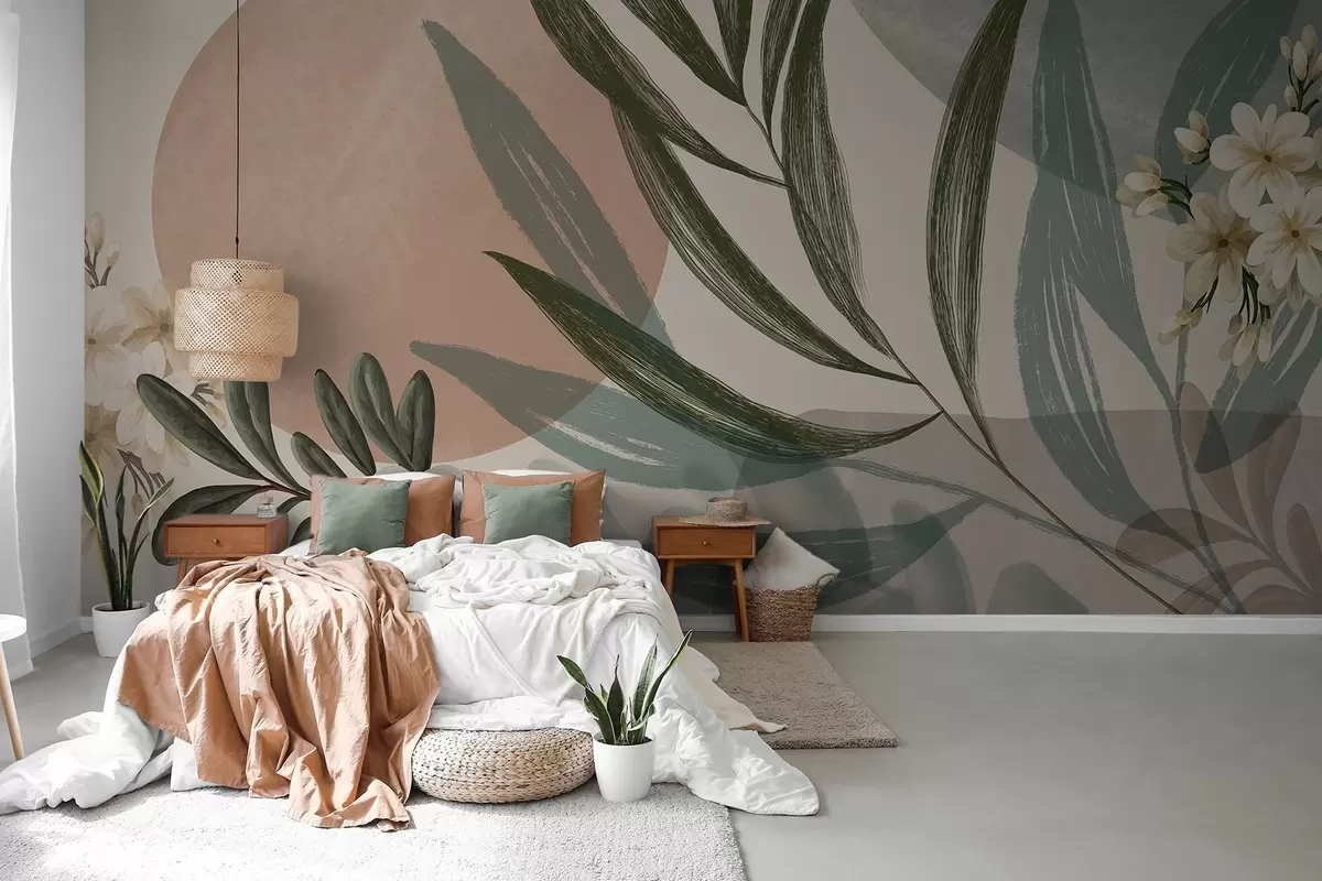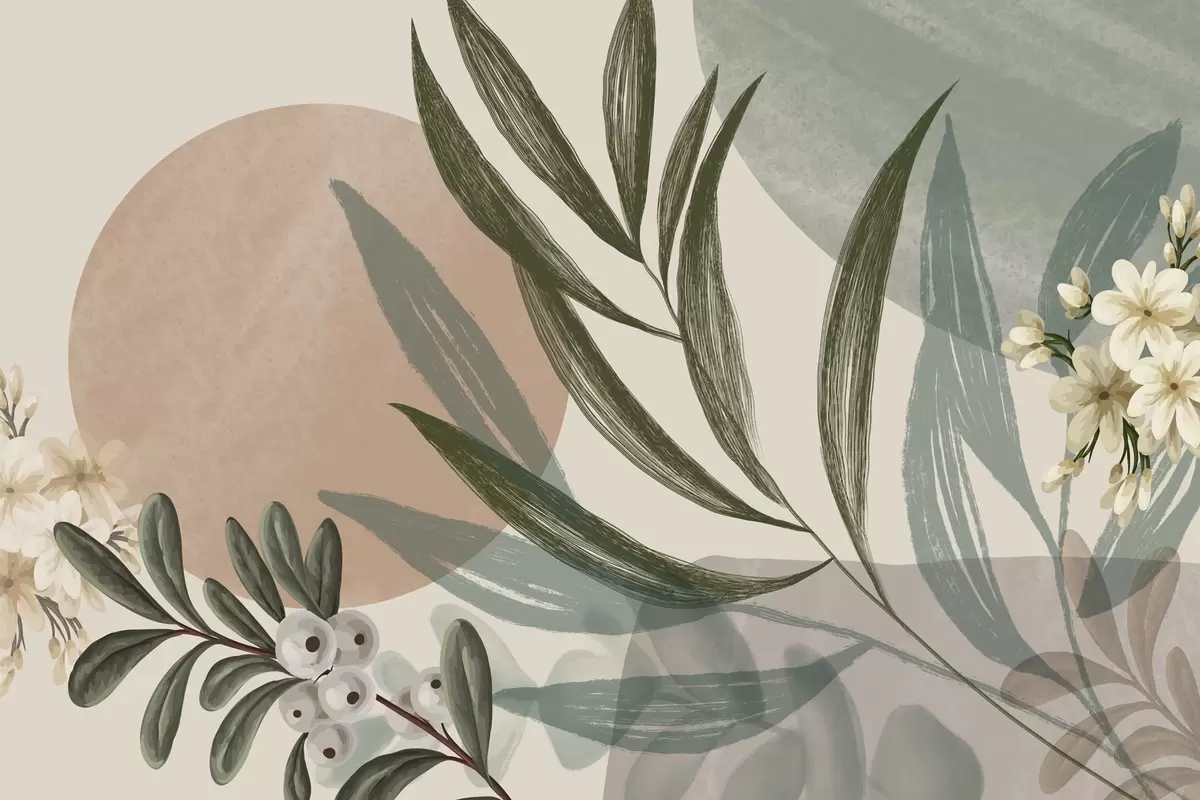 Papier peint photo Art botanique abstrait avec des feuilles de palmier vertes et des baies blanches, sur un fond de formes dans des tons de terre sourds N° w09312