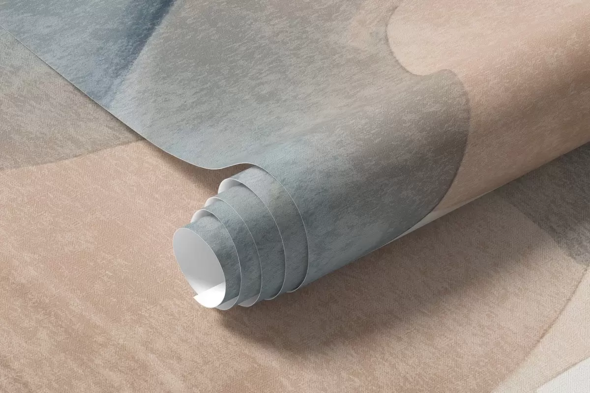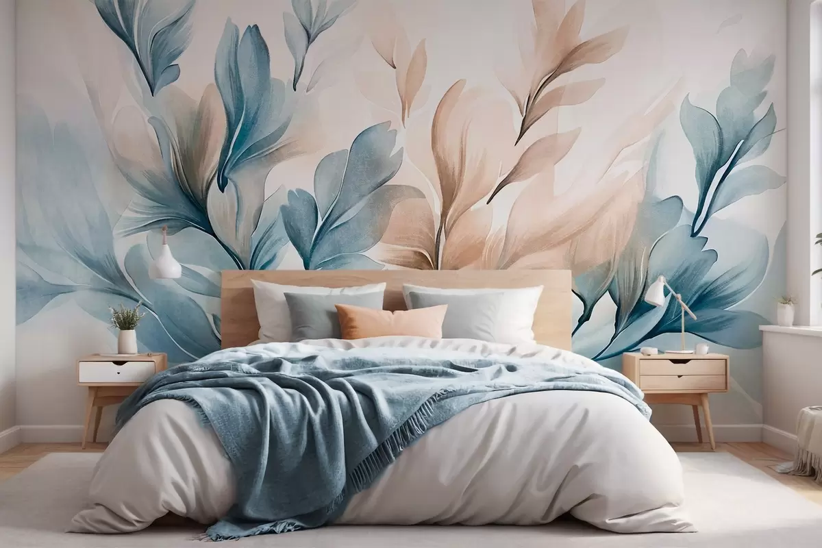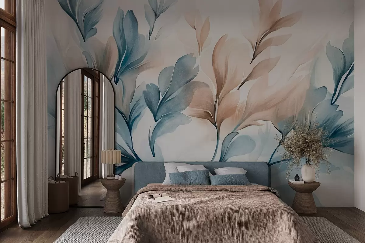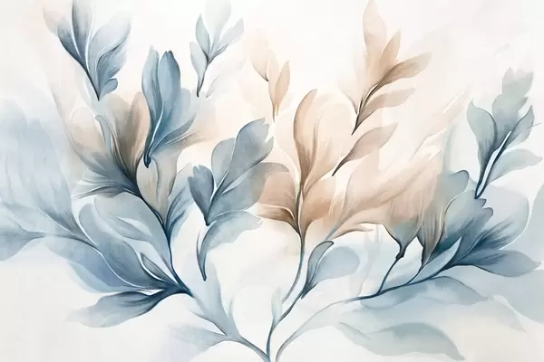 Papier peint photo Feuilles abstraites bleues et brunes avec des coups de pinceau visibles, légères et texturées, palette de couleurs douces, effet aquarelle N° w09313