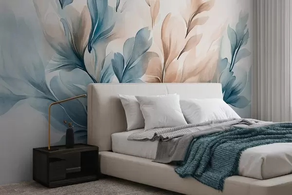 Papier peint photo Feuilles abstraites bleues et brunes avec des coups de pinceau visibles, légères et texturées, palette de couleurs douces, effet aquarelle N° w09313
