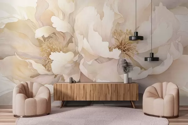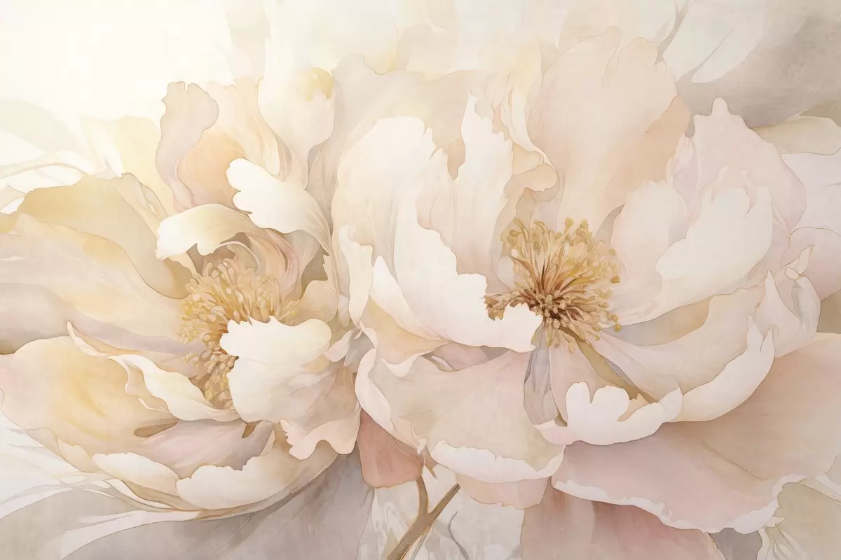Papier peint photo Fleurs à la texture de pivoine avec des pétales délicats dans des tons de pêche crème et de rose pâle avec une texture douce, semblable à celle d'une aquarelle N° w09321