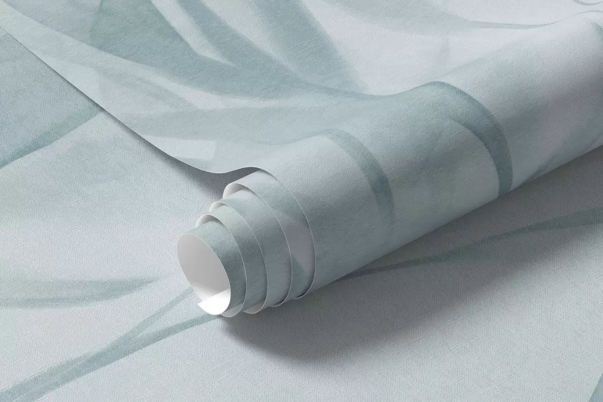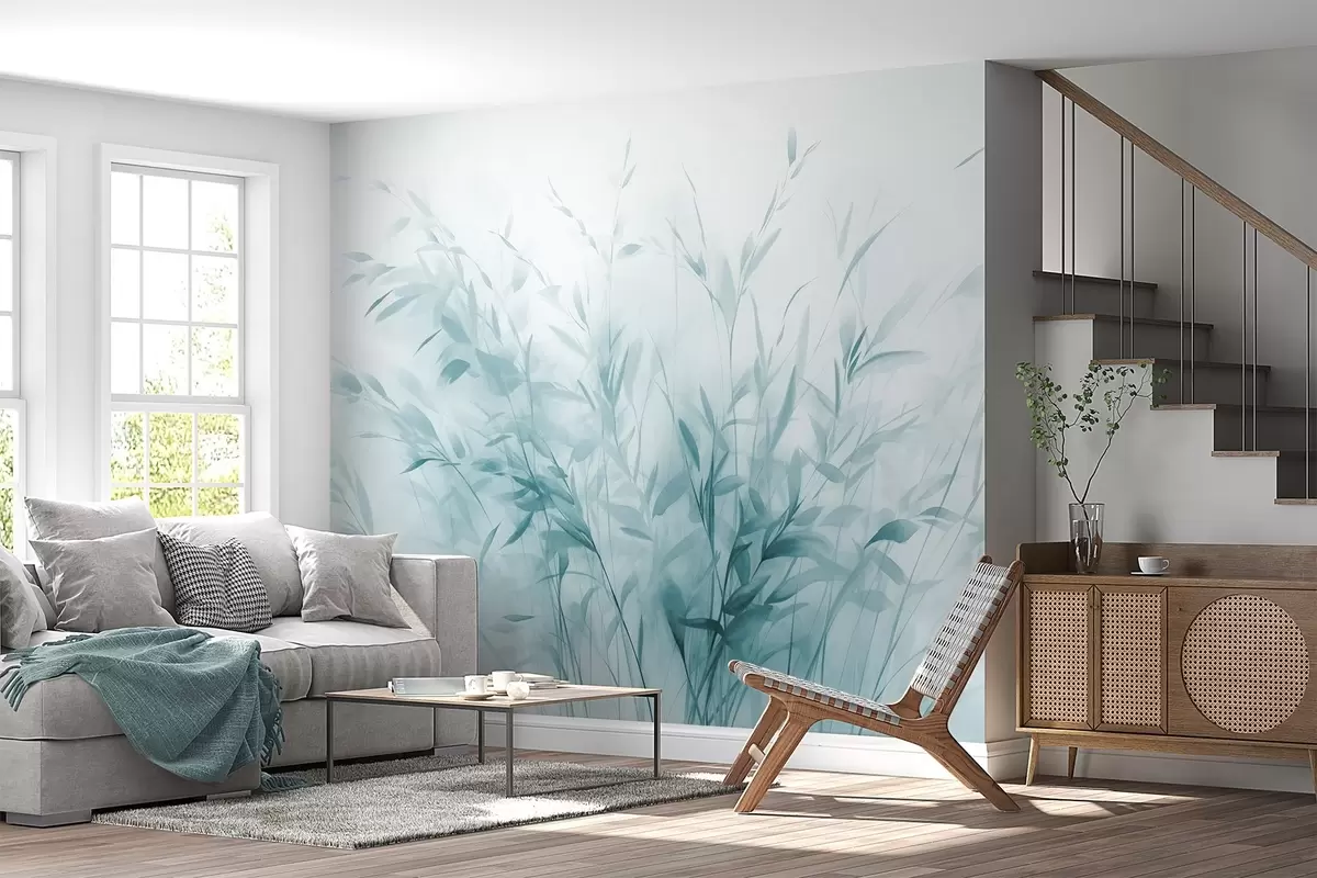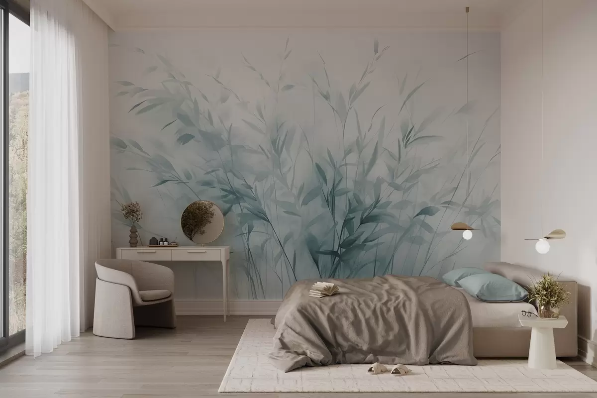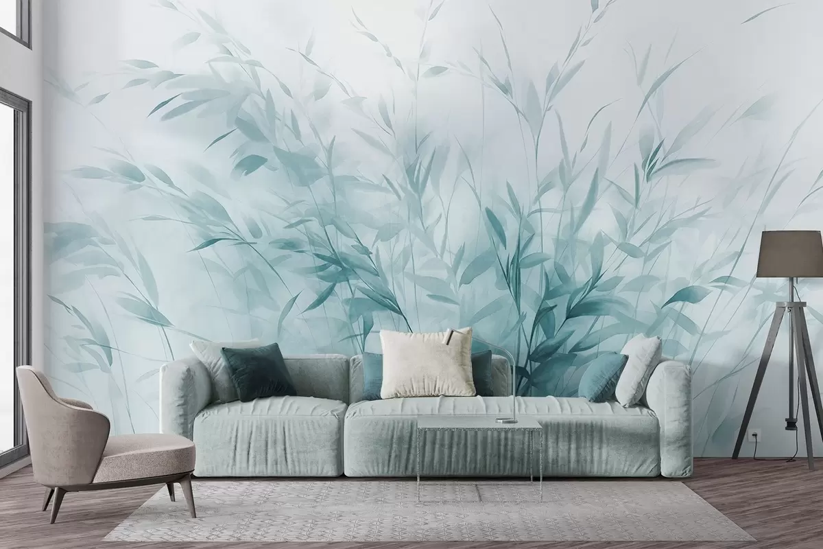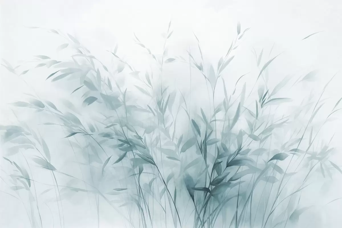 Papier peint photo Herbe et mauvaises herbes avec des feuilles et des tiges fines, couleurs bleu clair, coups de pinceau doux et délicats, impression minimaliste N° w09342v1