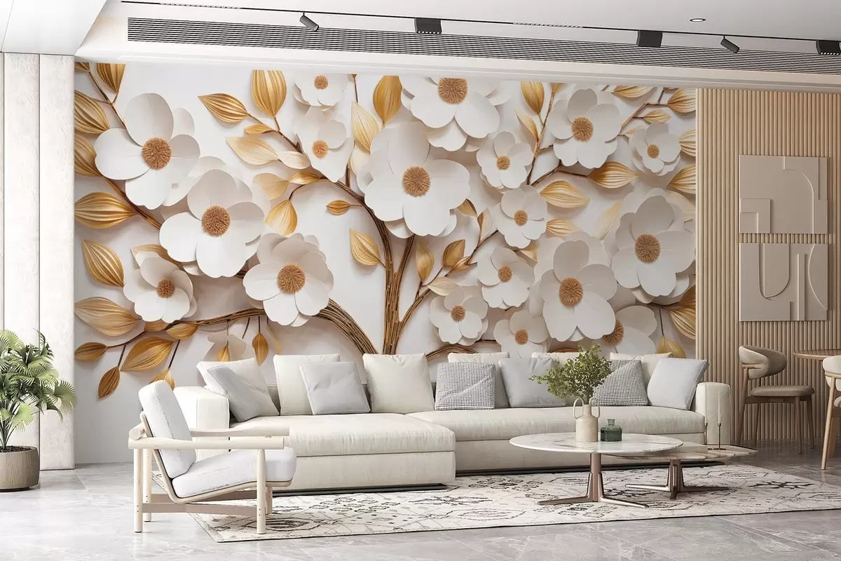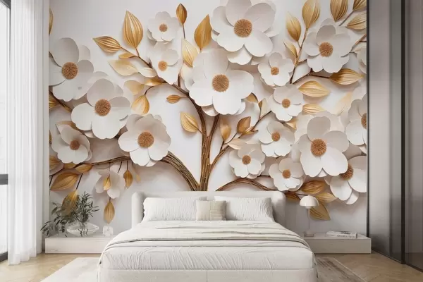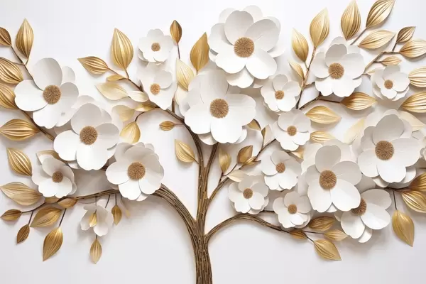 Papier peint photo Arbre avec fleurs blanches et imitation de feuilles en relief N° w09348