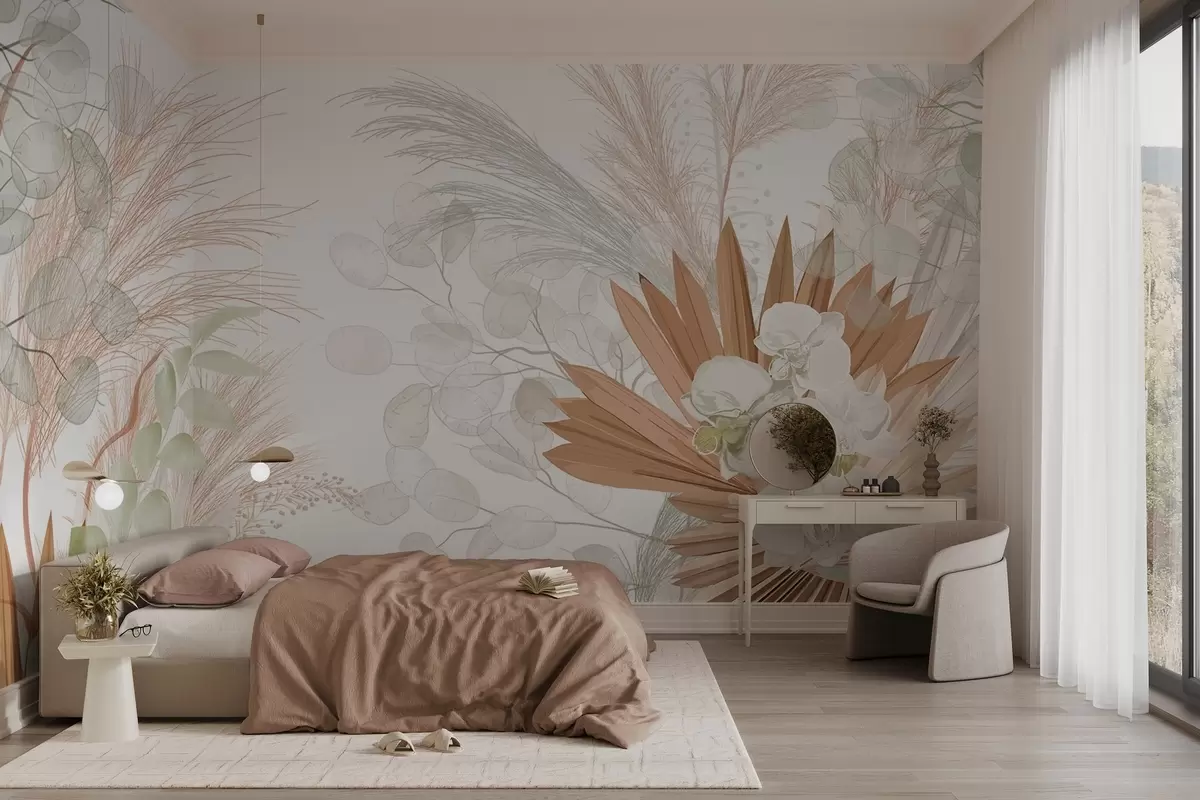 Papier peint photo Herbe de la pampa, eucalyptus, feuilles tropicales et orchidées sur fond blanc, couleurs pastel N° w09366