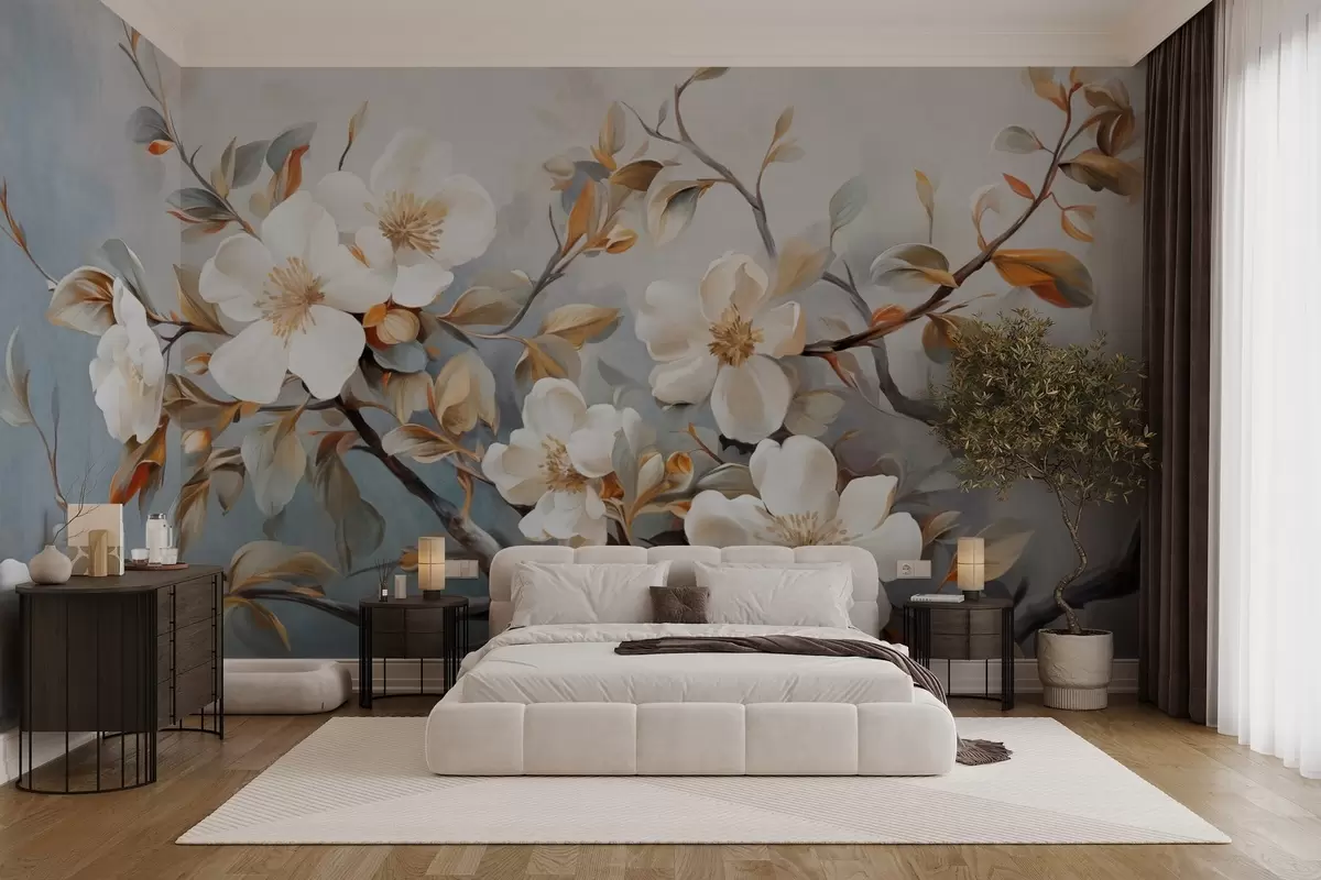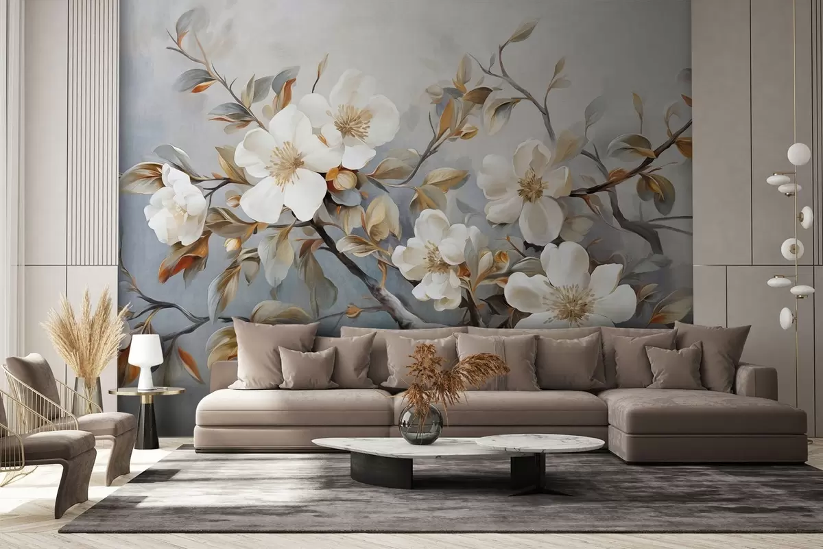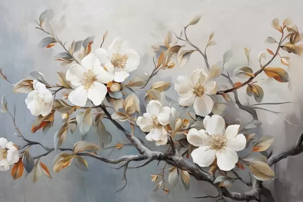 Papier peint photo Fleurs blanches avec pistils jaunes sur une branche d'arbre avec des feuilles, fond clair, style peinture vintage, impression texturée N° w09368