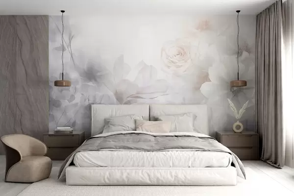 Papier peint photo Arrangement floral abstrait délicat avec des roses rose pastel et des magnolias, mise au point douce, arrière-plan gris clair N° w09371
