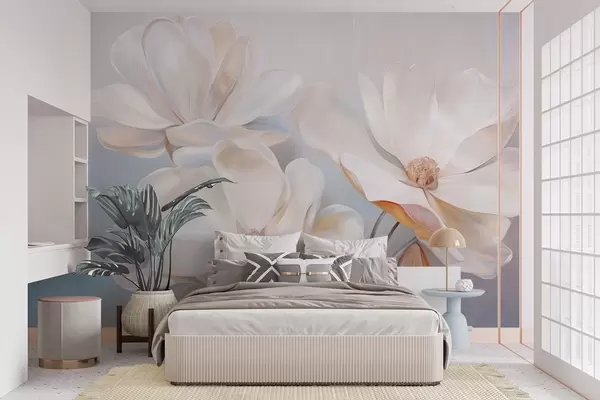 Papier peint photo Fleurs de magnolia blanches fantaisistes aux pétales délicatement texturés, sur fond abstrait et doux. N° w09373