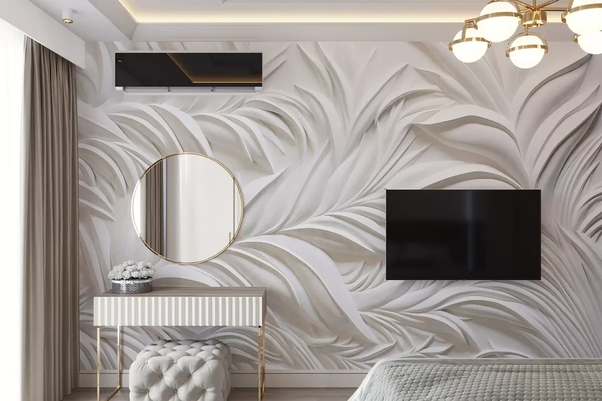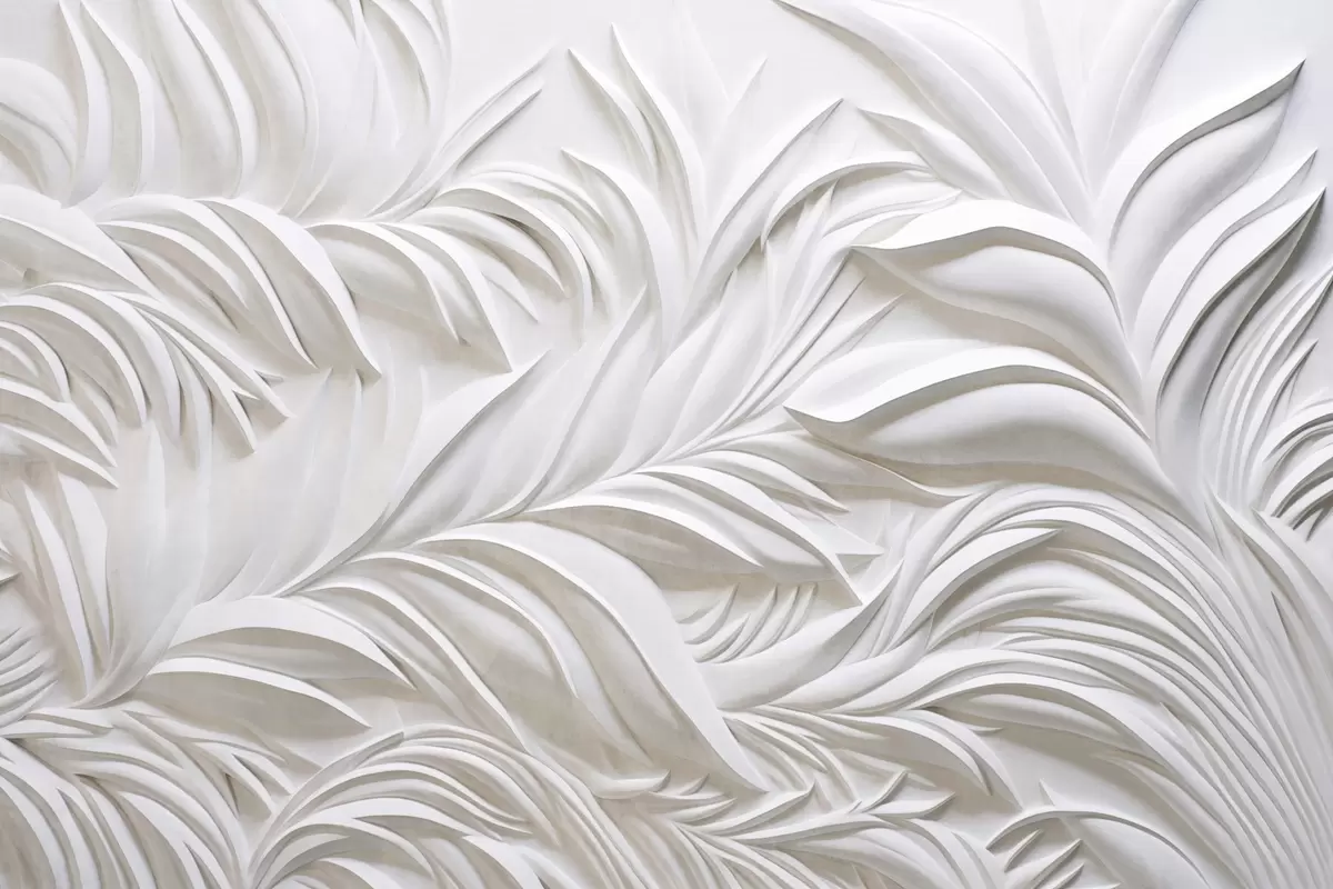 Papier peint photo Feuilles blanches texturées et éléments floraux abstraits, esthétique minimaliste N° w09378