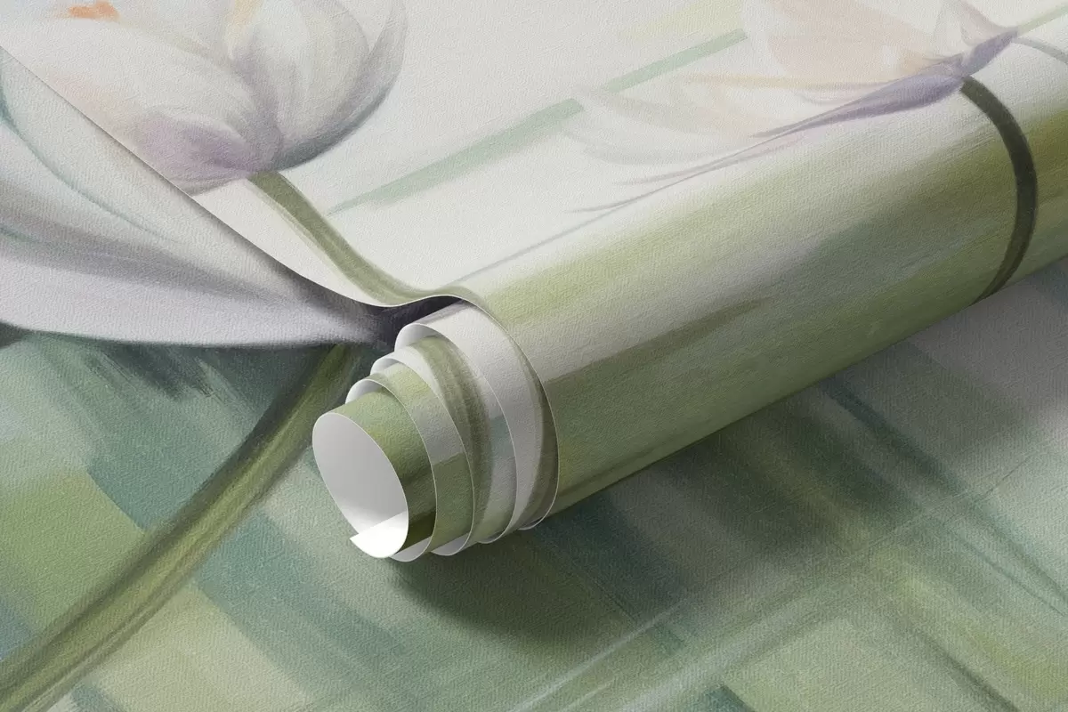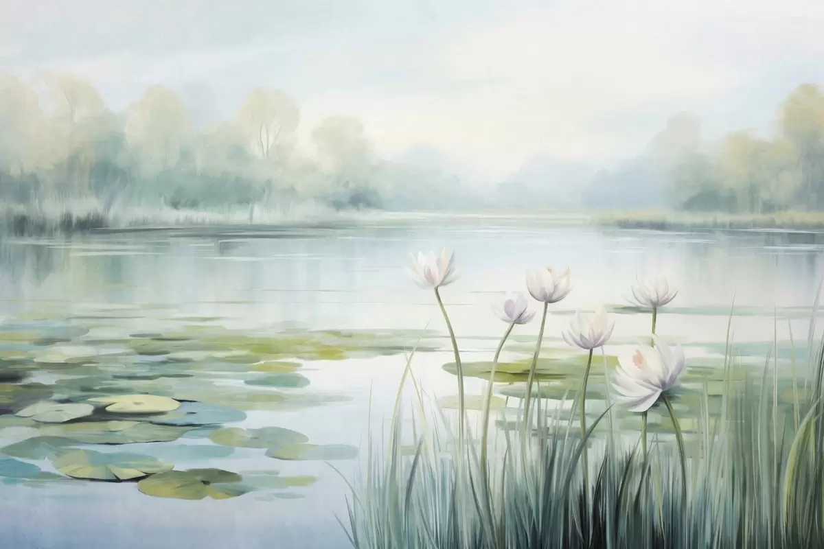 Papier peint photo Paysage avec un lac, des nénuphars et des feuilles de nénuphars, des arbres en arrière-plan, dans un environnement calme, tons bleu clair et vert N° w09395