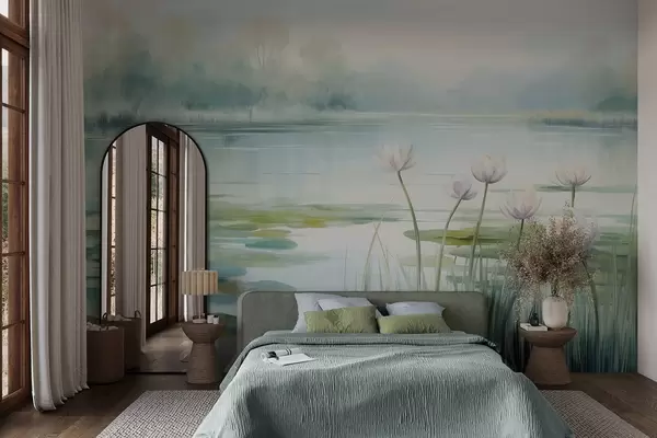 Papier peint photo Paysage avec un lac, des nénuphars et des feuilles de nénuphars, des arbres en arrière-plan, dans un environnement calme, tons bleu clair et vert N° w09395