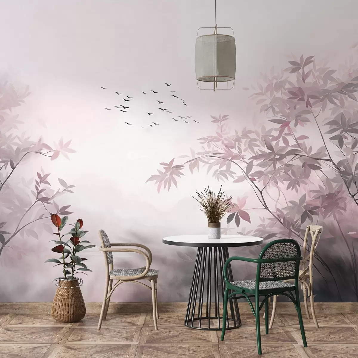 Papier peint photo Paysage texturé avec des arbres et une volée d'oiseaux volant dans le ciel, couleurs pastel, scène naturelle N° w09418v1