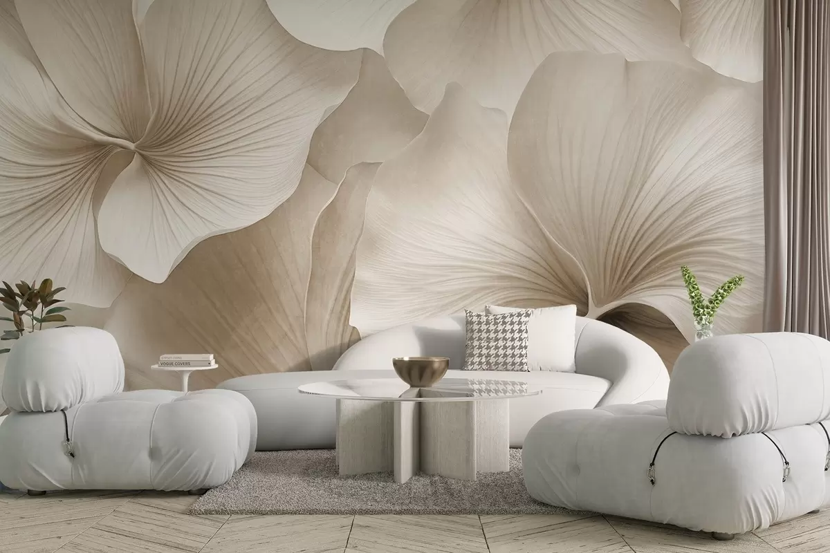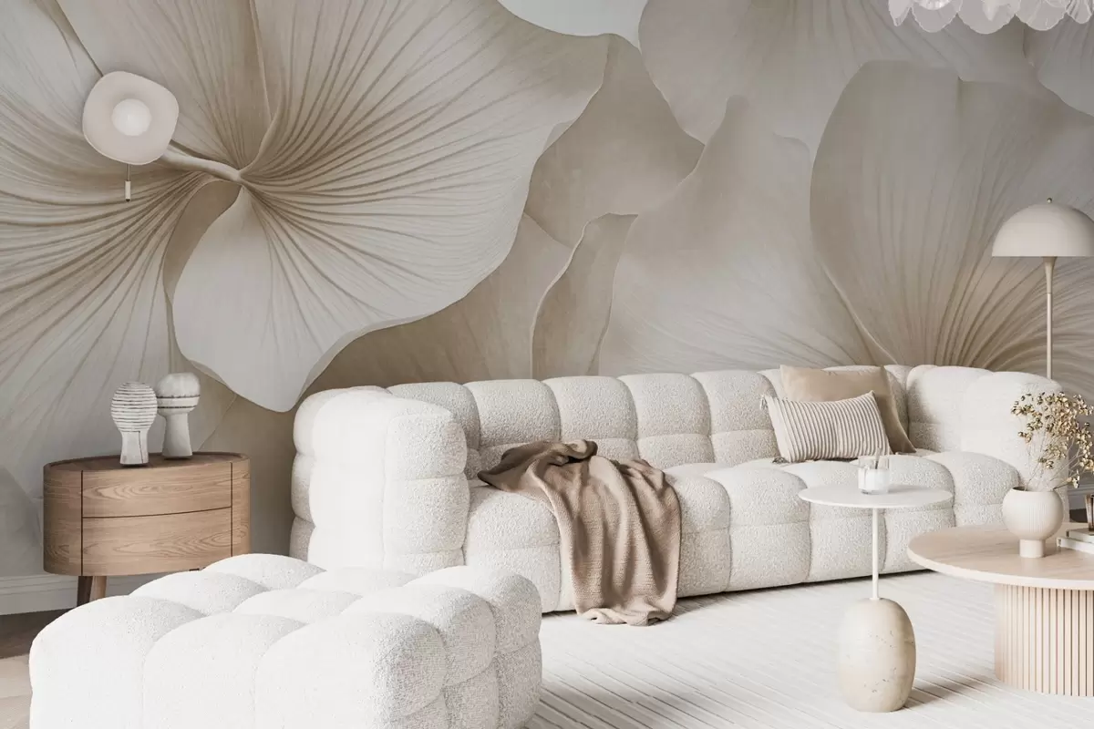 Papier peint photo Feuilles de ginkgo blanches et beiges, texture douce, fond floral abstrait, style minimaliste moderne N° w09421v1