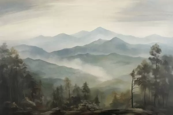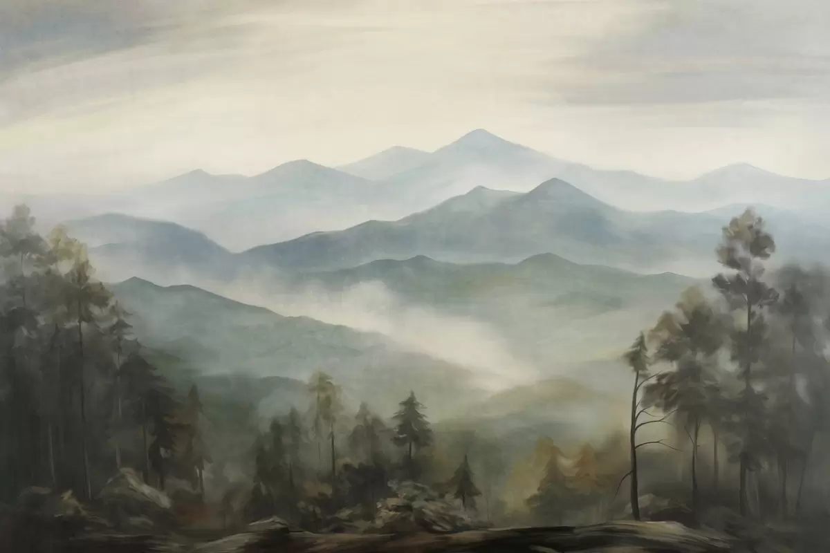Papier peint photo Chaîne de montagnes brumeuse avec des arbres, du brouillard, un ciel nuageux, des couleurs sourdes, style peinture paysagère N° w09424
