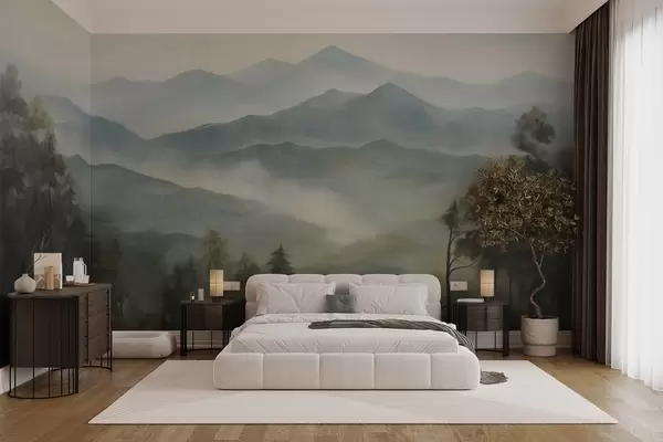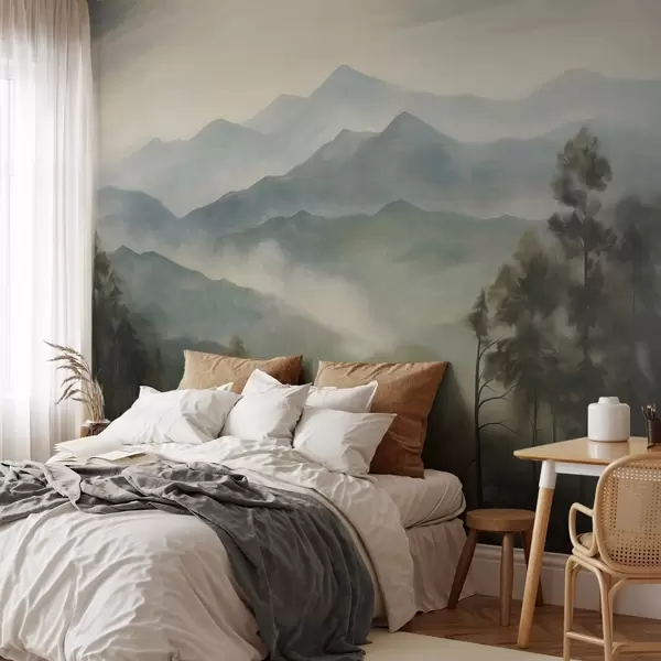Papier peint photo Chaîne de montagnes brumeuse avec des arbres, du brouillard, un ciel nuageux, des couleurs sourdes, style peinture paysagère N° w09424