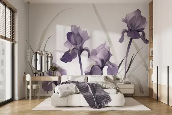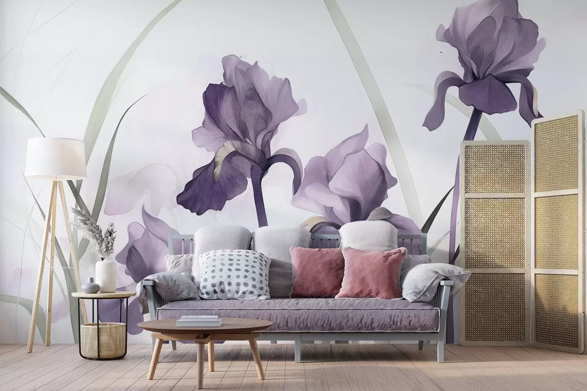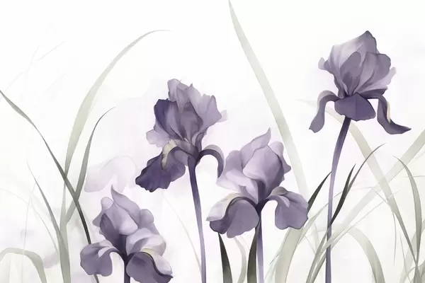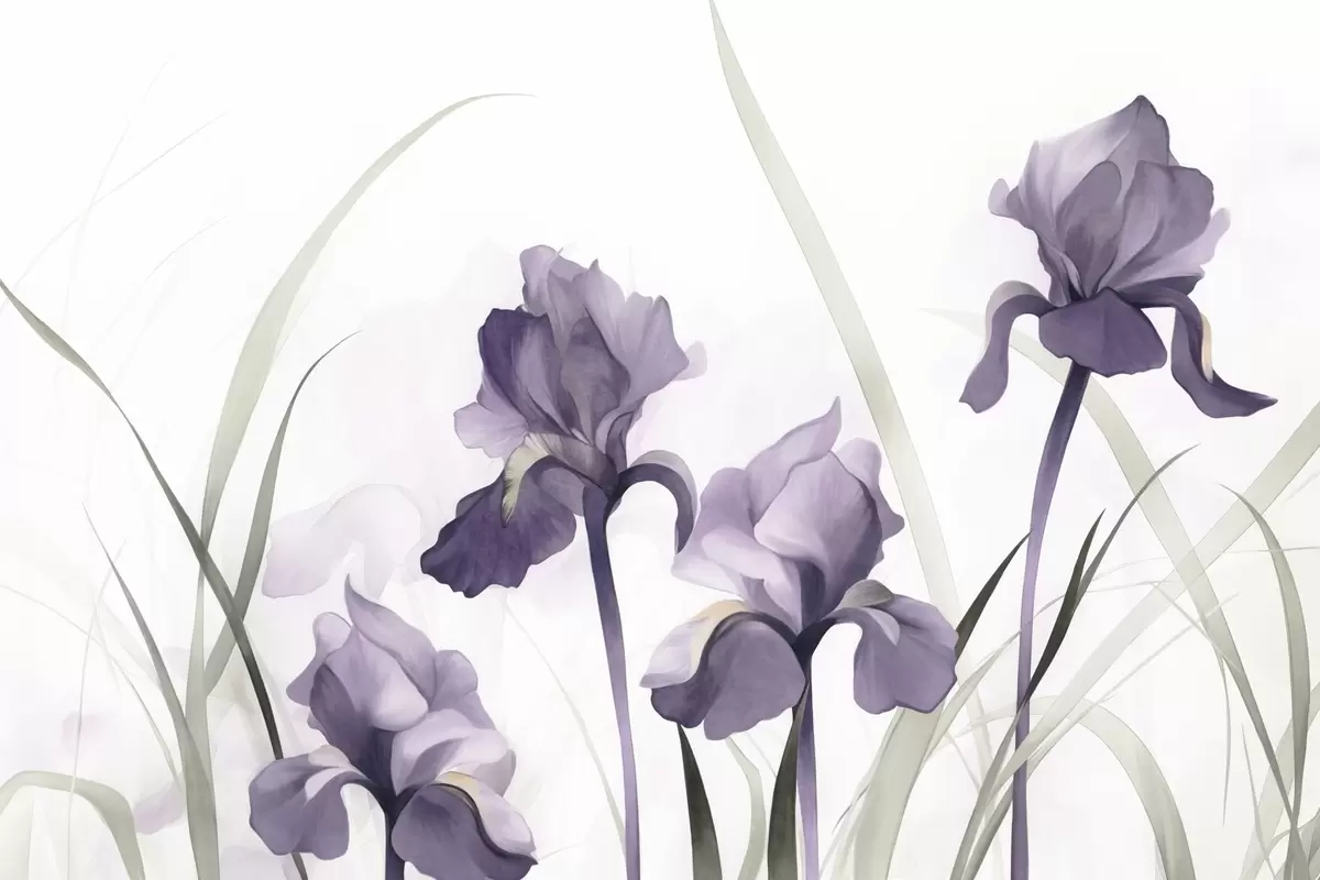 Papier peint photo Fleurs d'iris violettes avec tiges vertes, style aquarelle, fond blanc, couleurs douces, élégant, artistique N° w09425