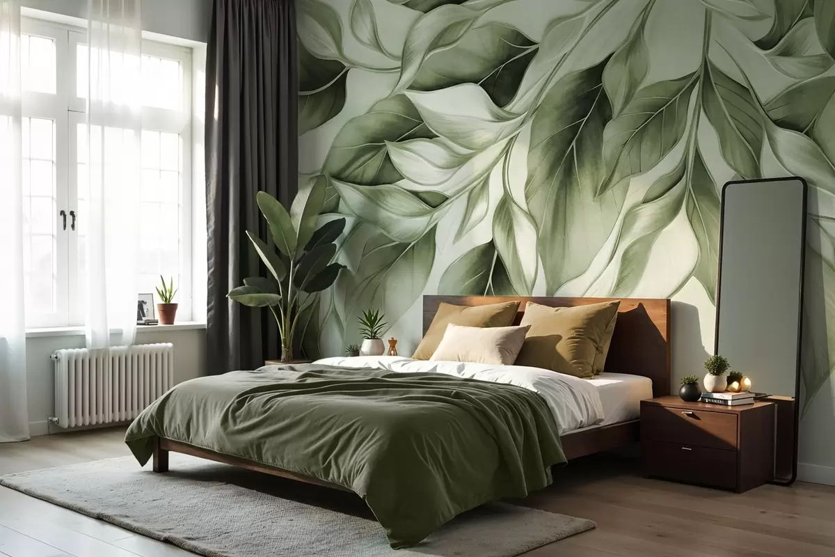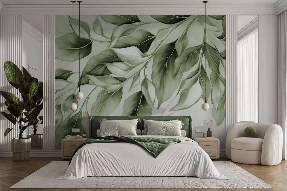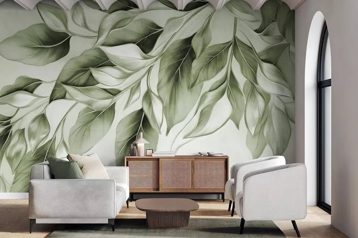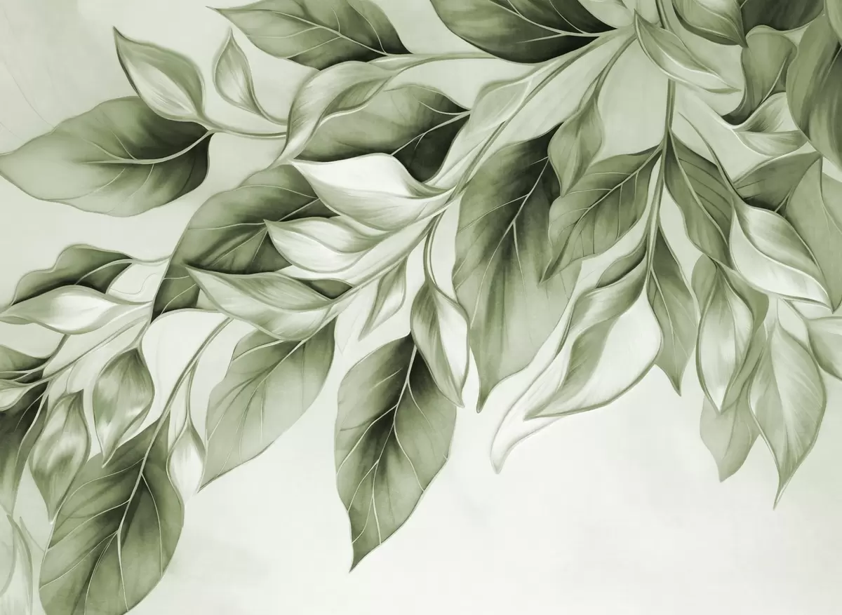 Papier peint photo Feuilles vertes texturées et discrètes, fond clair, design élégant et artistique, style moderne N° w09429v1