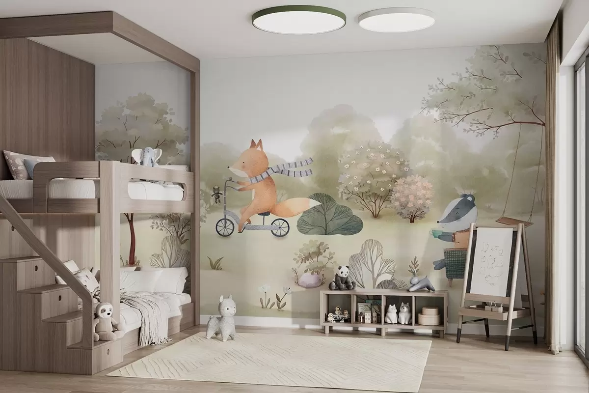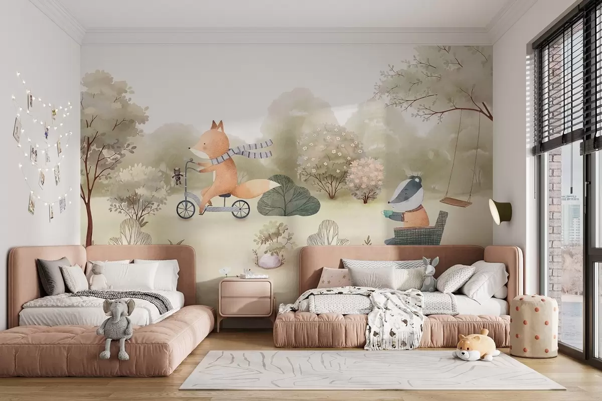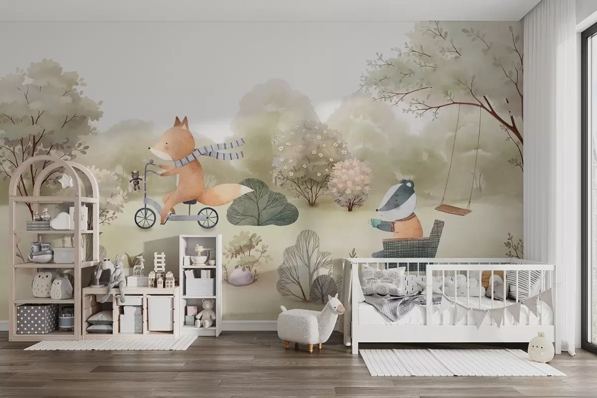 Papier peint photo Renard à vélo et blaireau avec du thé, animaux de la forêt peints à l'aquarelle N° w09439