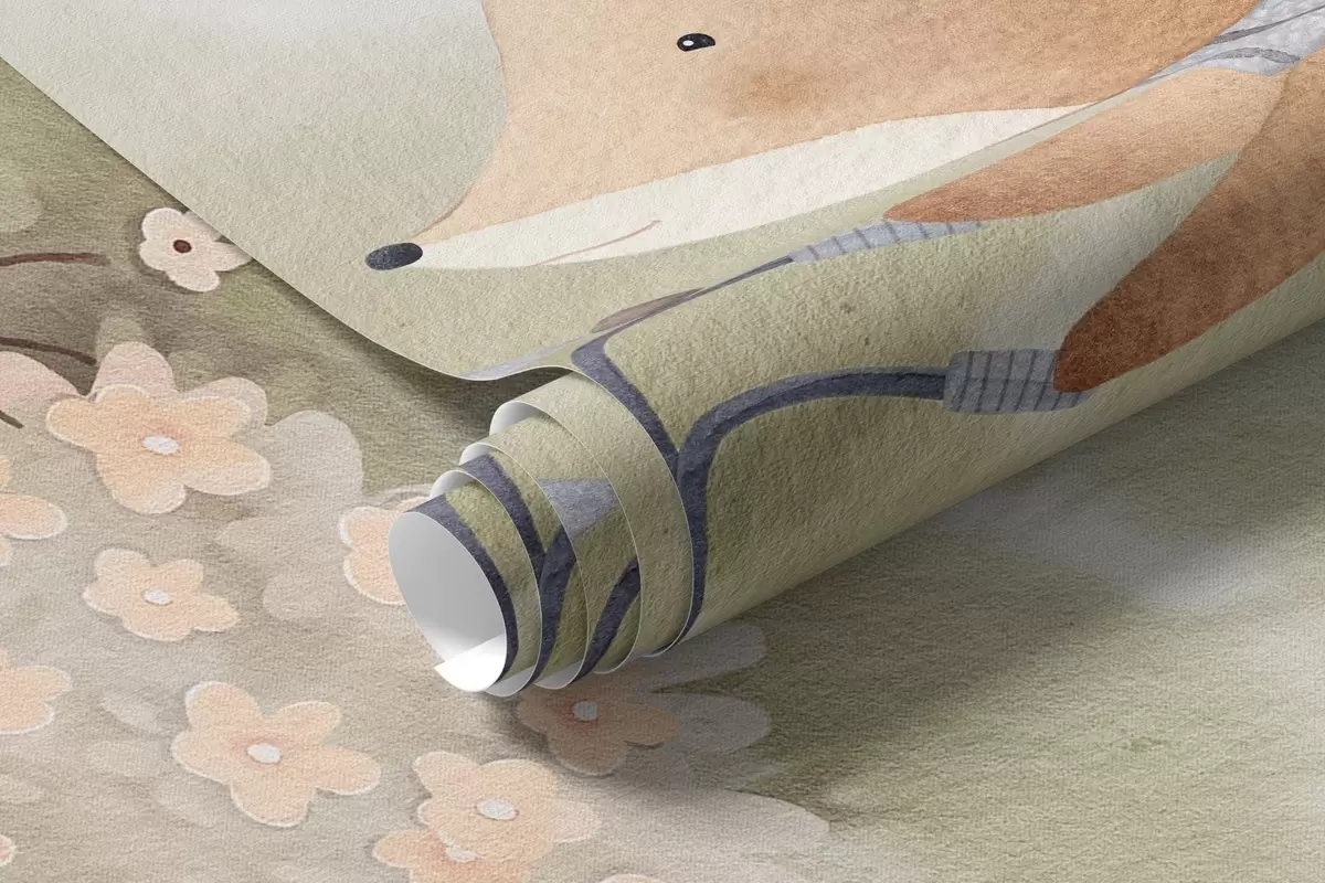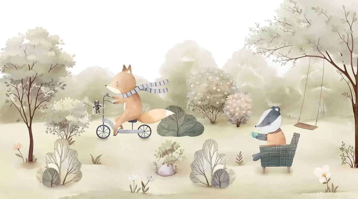 Papier peint photo Renard à vélo et blaireau avec du thé, animaux de la forêt peints à l'aquarelle N° w09439